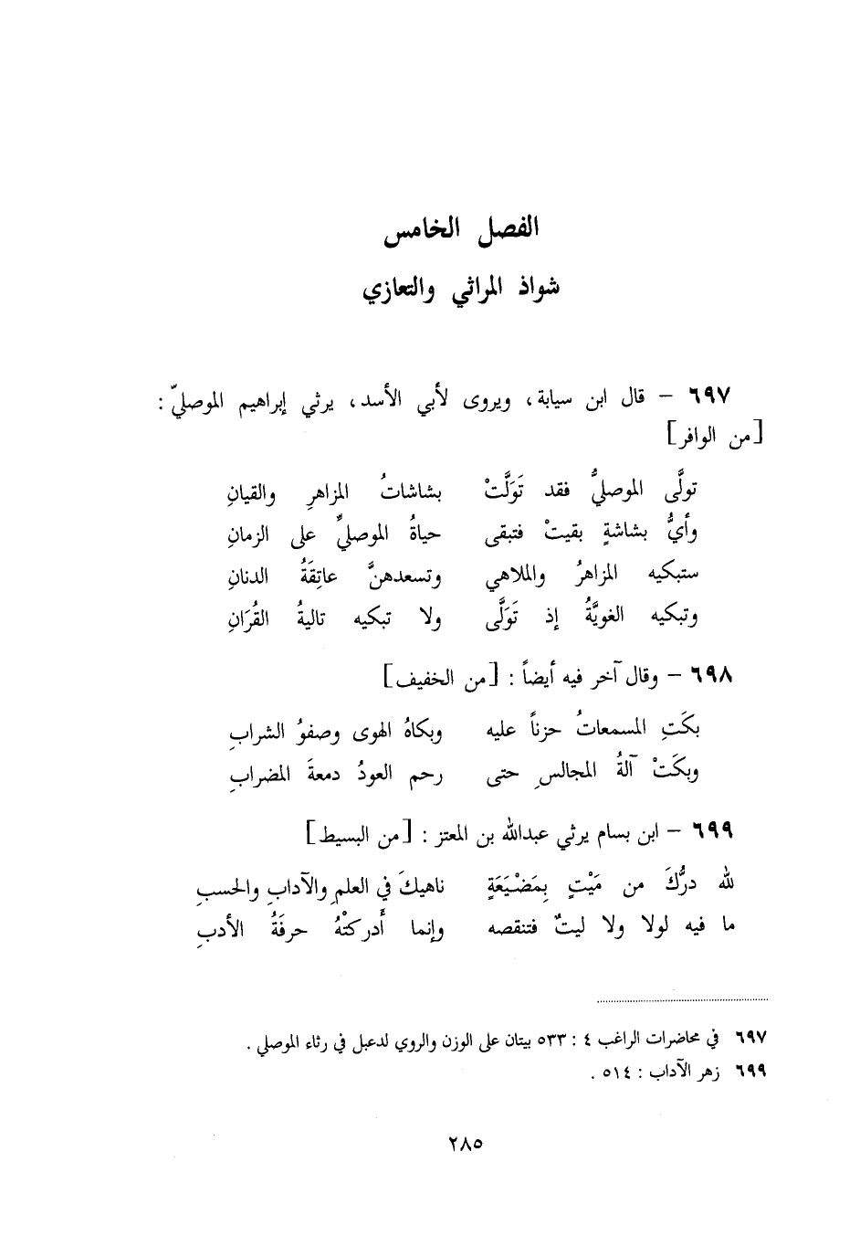 «697» - قال ابن سيابة، ويروى لأبي الأسد، يرثي إبراهيم الموصليّ: