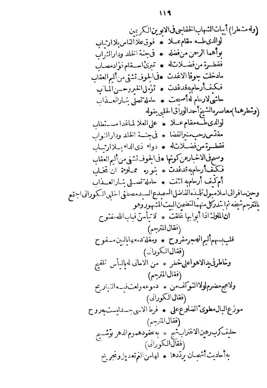 وله مشطراً أبيات الشهاب الخفاجي في الأبوين الكريمين