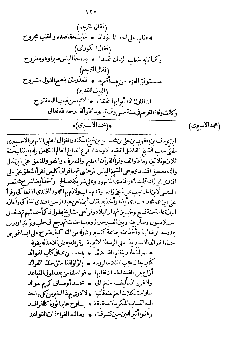 ابن يوسف بن يعقوب بن علي بن محسن بن شيخ اسكندر الغزالي الحلبي الشهير بالأسبيري مفتي حلب الشيخ الفاضل الفقيه الأوحد البارع الصالح العالم الكامل ولد بعينتاب سنة ثلاث وثلاثين ومائة وألف وقرأ القرآن العظيم والصرف والنحو والمنطق على ابن خال والده مصطفى أفندي وعلى الشيخ الياس المرعشي ثم سافر إلى كليس فقرأ المنطق على علي أفندي نجي زاده تلميذ تاتار أفندي المشهور وعلى شريكه صالح وأخذ أيضاً شرح مختصر المنتهى لأبن الحاجب عن شيخي زاده وقدم حلب ولازم بها محموداً أفندي الأنطاكي وقرأ على ابن عمه محمد أفندي أيضاً وأخذ بعينتاب أيضاً عن عبد الرحمن أفندي الخاكي وأجازه اجازة عامة سنة تسع وخمسين ثم دار البلاد وقرأ على مشايخ يطول ذكر أسمائهم ثم دخل اسلامبول وصار بينه وبين نفير حبر الروم مباحثات ثم رجع إلى حلب وتوطنها ودرس بمدرسة الرضائية وأخذ عنه جماعة كثيرون وله من التآليف شرح على ايساغوجي سماه الفوائد الأسبيرية على الرسالة الأثيرية وقرظه بعض تلامذته بقوله
