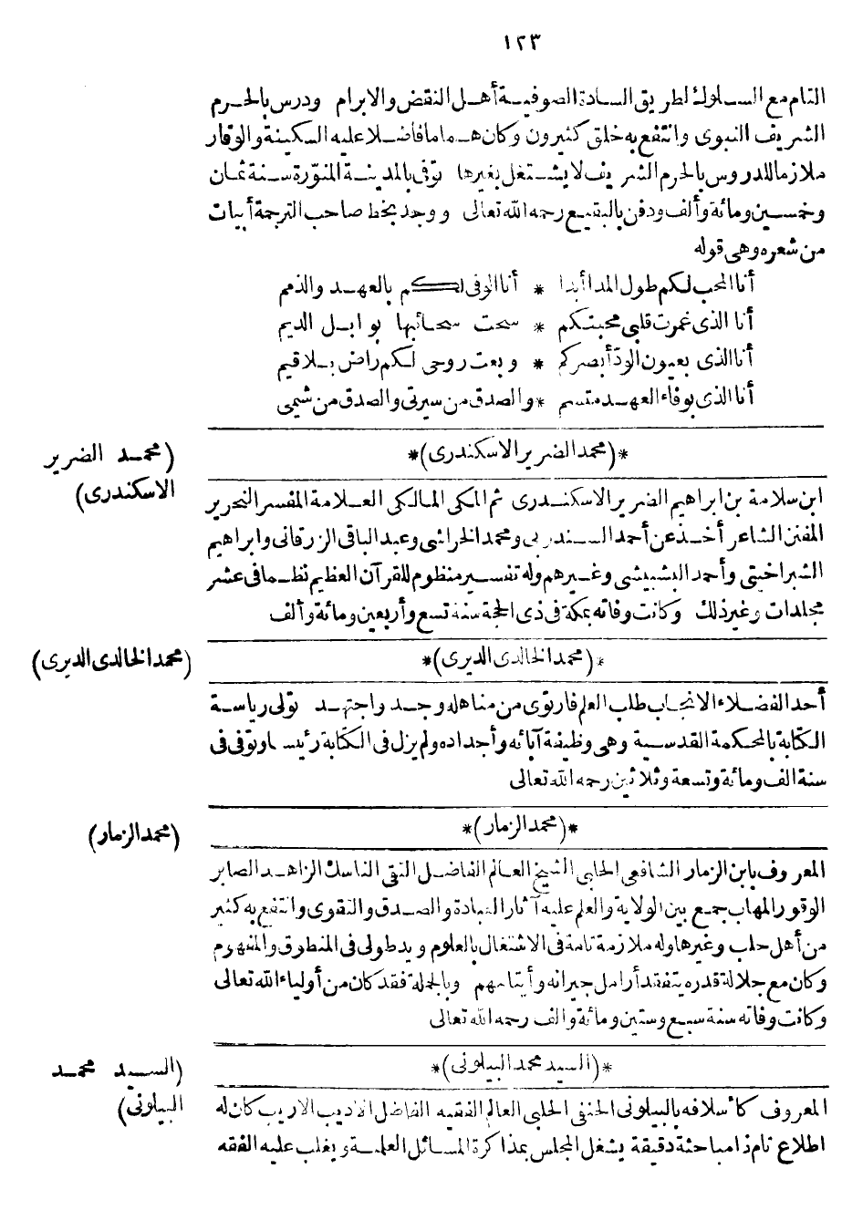 المعروف بابن الزمار الشافعي الحلبي الشيخ العالم الفاضل التقي الناسك الزاهد الصابر الوقور المهاب جمع بين الولاية والعلم عليه آثار العبادة والصدق والتقوى وانتفع به كثير من أهل حلب وغيرها وله ملازمة تامة في الاشتغال بالعلوم ويد طولى في المنطوق والمفهوم وكان مع جلالة قدره يتفقد أرامل جيرانه وأيتامهم وبالجملة فقد كان من أولياء الله تعالى وكانت وفاته سنة سبع وستين ومائة وألف رحمه الله تعالى