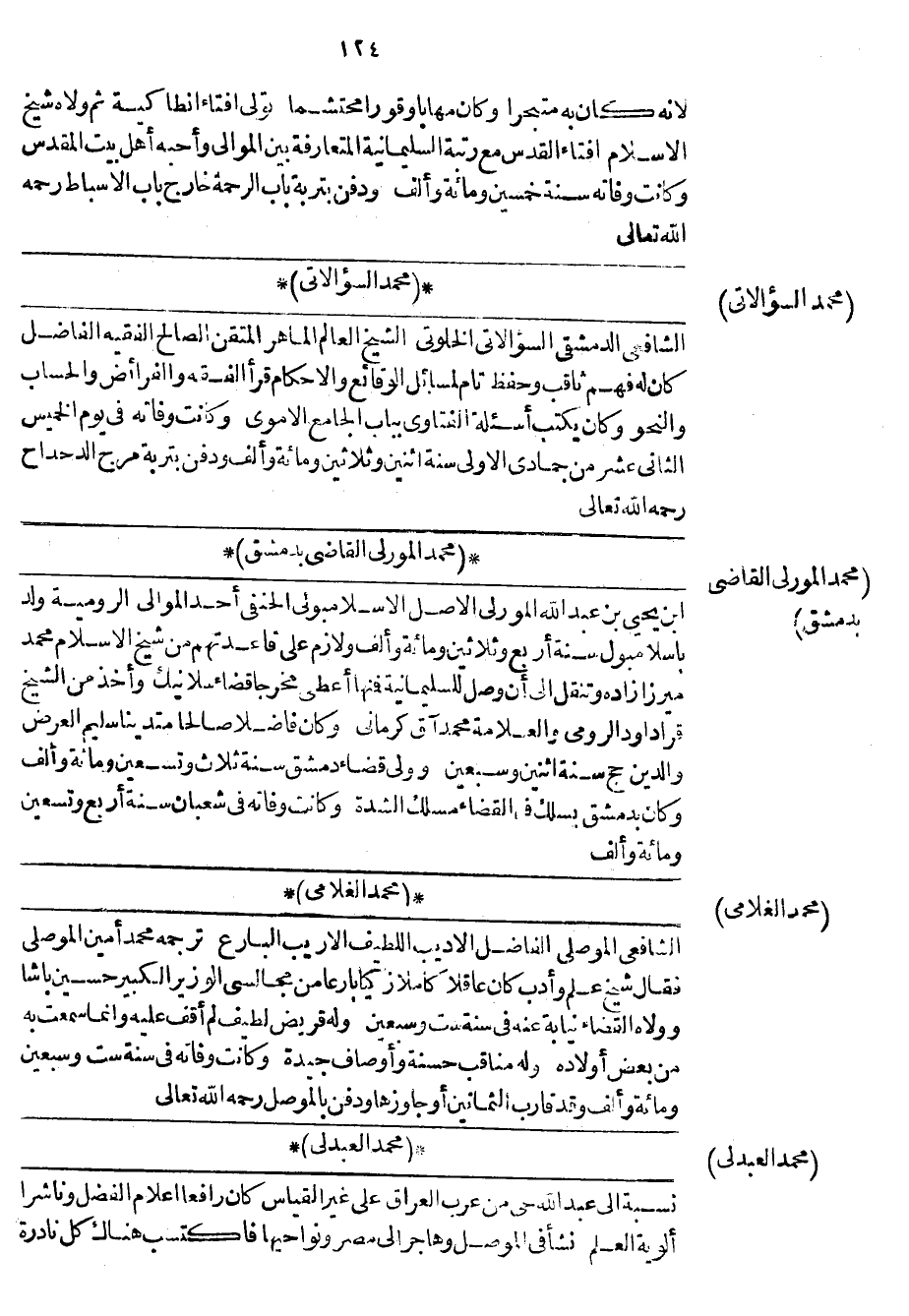 الشافعي الدمشقي السؤالاتي الخلوتي الشيخ العالم الماهر المتقن الصالح الفقيه الفاضل كان له فهم ثاقب وحفظ تام لمسائل الوقائع والأحكام قرأ الفقه والفرائض والحساب والنحو وكان يكتب أسئلة الفتاوي بباب الجامع الأموي وكانت وفاته في يوم الخميس الثاني عشر من جمادي الأولى سنة اثنين وثلاثين ومائة وألف ودفن بتربة مرج الدحداح رحمه الله تعالى