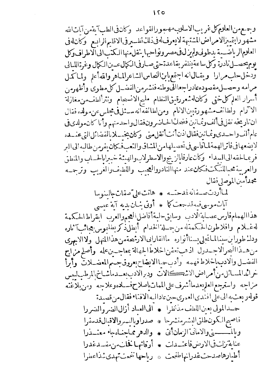 وجمع من العلوم كل غريب الأسلوب مهجور القواعد وكان في الطب آية من آيات الله مشهوراً بتمييز الأمراض المشتبهة لا يعرف له في ذلك نظير في الاقليم الرابع وكان له في العلوم الرياضية يد طولى ولم يزل في مصر ونواحيها ينقل منها الكتب إلى الأطراف وكل يوم يحصل نادرة وكل ساعة يظفر بقاعدة حتى صار في الكمال عين الكمال وغرة الليالي ودخل حلب مراراً ويقال إنه اجتمع بابن النحاس الشاعر الماهر والله أعلم ولما كمل مرامه وحصل مقصوده عاد راجعاً إلى وطنه فنشر من الفضل كل مطوي وأظهر من أسرار العلم كل خفي وكان له شعر رقيق النظام مليح الانسجام ونثر ألطف من مغازلة الآرام ولطائف مشهورة بين الأنام ومن لطائفه أنه سئل في مجلس عن مولده فقال إن تاريخه نقل في ألف وثمانين فضحك الحاضرون فقال واحد منهم وأنا كان مولدي في عام ألف وإحدى وثمانين فقال إذن أنت أنقل مني وكان بخيلاً بالفضائل التي عنده لا يضعها في فاتر الهمة لما قاسى في تحصيلها من المشاق والتعب فكان يفر من طالبه إلى البر فربما لحقه إلى البيداء وكان عارفاً بالزيج والاسطرلاب والهيئة خبيراً بالحساب والمنطق والعربية محباً للنكب فكان عند منها النادور والعجيب واللطيف والغريب وترجمه محمد أمين الموصلي فقال