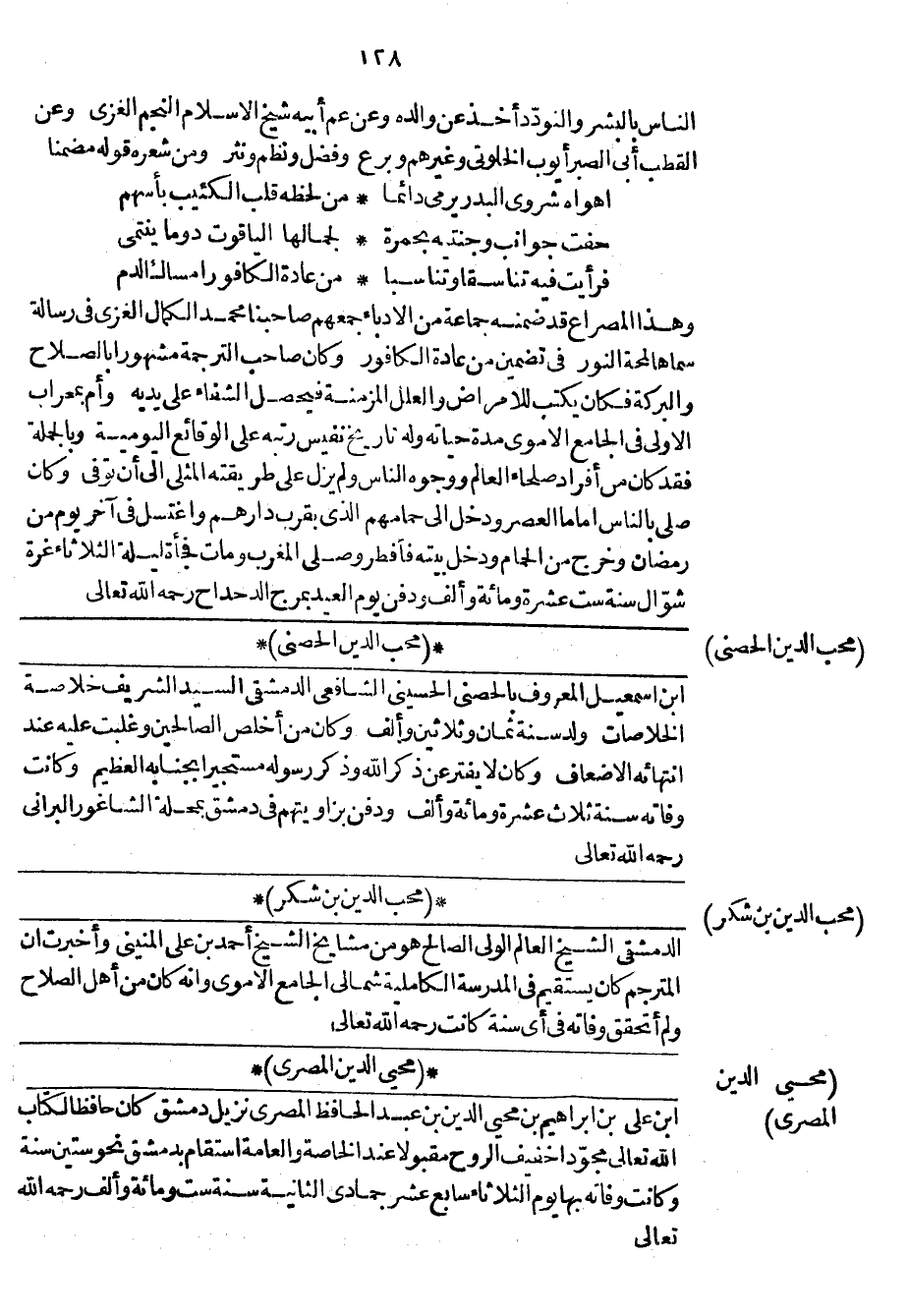 وهذا المصراع قد ضمنه جماعة من الأدباء جمعهم صاحبنا محمد الكمال الغزي في رسالة سماها لمحة النور في تضمين من عادة الكافور وكان صاحب الترجمة مشهوراً بالصلاح والبركة فكان يكتب للأمراض والعلل المزمنة فيحصل الشفاء على يديه وأم بمحراب الأولى في الجامع الأموي مدة حياته وله تاريخ نفيس رتبه على الوقائع اليومية وبالجملة فقد كان من أفراد صلحاء العالم ووجوه الناس ولم يزل على طريقته المثلى إلى أن توفي وكان صلى بالناس اماماً العصر ودخل إلى حمامهم الذي بقرب دارهم واغتسل في آخر يوم من رمضان وخرج من الحمام ودخل بيته فأفطر وصلى المغرب ومات فجأة ليلة الثلاثاء غرة شوال سنة ست عشرة ومائة وألف ودفن يوم العيد بمرج الدحداح رحمه الله تعالى.
