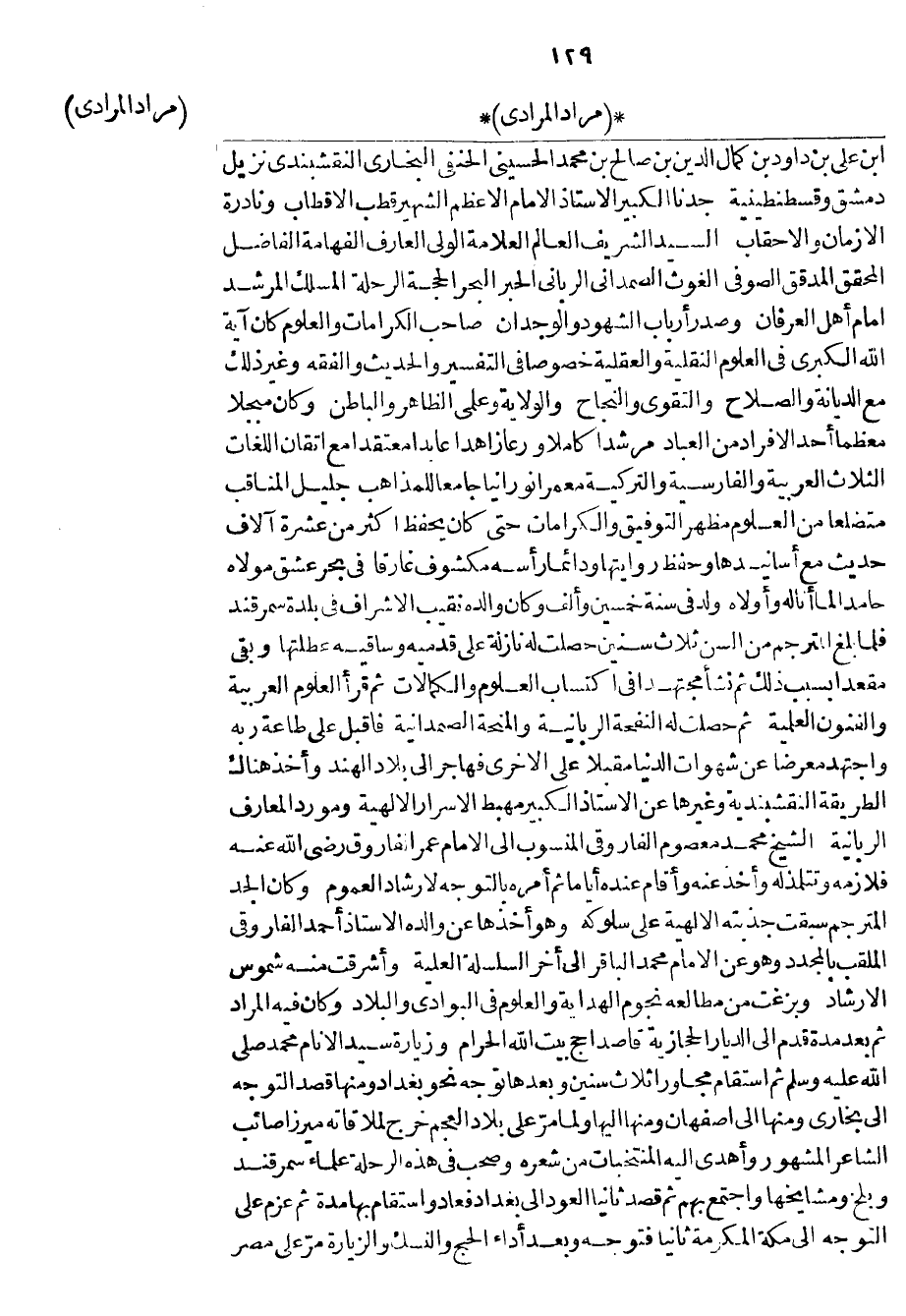 ابن علي بن داود بن كمال الدين بن صالح بن محمد الحسيني الحنفي البخاري النقشبندي نزيل دمشق وقسطنطينية جدنا الكبير الأستاذ الامام الأعظم الشهير قطب الأقطاب ونادرة الأزمان والأحقاب السيد الشريف العالم العلامة الولي العارف الفهامة الفاضل المحقق المدقق الصوفي الغوث الصمداني الرباني الحبر البحر الحجة الرحلة المسلك المرشد امام أهل العرفان وصدر أرباب الشهود والوجدان صاحب الكرامات والعلوم كان آية الله الكبرى في العلوم النقلية والعقلية خصوصاً في التفسير والحديث والفقه وغير ذلك مع الديانة والصلاح والتقوى والنجاح والولاية وعلمي الظاهر والباطن وكان مبجلاً معظماً أحد الأفراد من العباد مرشداً كاملاً ورعاً زاهداً عابداً معتقداً مع اتقان اللغات الثلاث العربية والفارسية والتركية معمراً نورانياً جامعاً للمذاهب جليل المناقب متضلعاً من العلوم مظهر التوفيق والكرامات حتى كان يحفظ أكثر من عشرة آلاف حديث مع أسانيدها وحفظ روايتها ودائماً رأسه مكشوف غارقاً في بحر عشق مولاه حامداً لما أناله وأولاه ولد في سنة خمسين وألف وكان والده نقيب الأشراف في بلدة سمرقند فلما بلغ المترجم من السن ثلاث سنين حصلت له نازلة على قدميه وساقيه عطلتها وبقي مقعداً بسبب ذلك ثم نشأ مجتهداً في اكتساب العلوم والكمالات ثم قرأ العلوم العربية والفنون العلمية ثم حصلت له النفحة الربانية والمنحة الصمدانية فأقبل على طاعة ربه واجتهد معرضاً عن شهوات الدنيا مقبلاً على الاخرى فهاجر إلى بلاد الهند وأخذ هناك الطريقة النقشبندية وغيرها عن الأستاذ الكبير مهبط الأسرار الألهية ومورد المعارف الربانية الشيخ محمد معصوم الفاروقي المنسوب إلى الامام عمر الفاروق رضي الله عنه فلازمه وتتلمذ له وأخذ عنه وأقام عنده أياماً ثم أمره بالتوجه لارشاد العموم وكان الجد المترجم سبقت جذبته الألهية على سلوكه وهو أخذها عن والده الأستاذ أحمد الفاروقي الملقب بالمجدد وهو عن الامام محمد الباقر إلى أخر السلسلة العلية وأشرقت منه شموس الارشاد وبزغت من مطالعه نجوم الهداية والعلوم في البوادي والبلاد وكان فيه المراد ثم بعد مدة قدم إلى الديار الحجازية قاصداً حج بيت الله الحرام وزيارة سيد الأنام محمد صلى الله عليه وسلم ثم استقام مجاوراً ثلاث سنين وبعدها توجه نحو بغداد ومنها قصد التوجه إلى بخارى ومنها إلى أصفهان ومنها إليها ولما مر على بلاد العجم خرج لملاقاته ميرزا صائب الشاعر المشهور وأهدى إليه المنتخبات من شعره وصحب في هذه الرحلة علماء سمرقند وبلخ ومشايخها واجتمع بهم ثم قصد ثانياً العود إلى بغداد فعاد واستقام بها مدة ثم عزم على التوجه إلى مكة المكرمة ثانياً فتوجه وبعد أداء الحج والنسك والزيارة مر على مصر