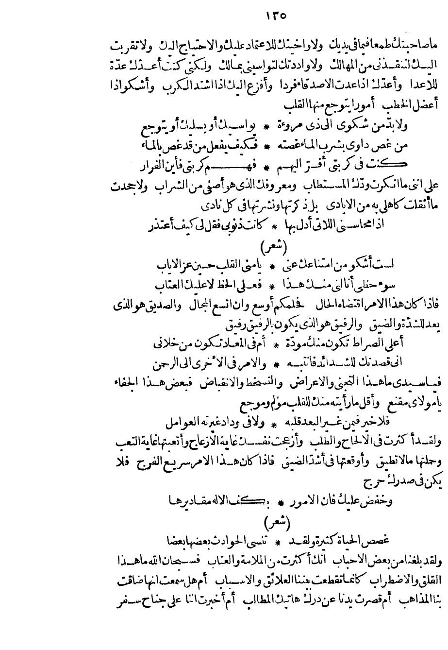 ولقد بلغنا من بعض الأحباب إنك أكثرت من الملامة والعتاب فسبحان الله ما هذا القلق والاضطراب كإنما تقطعت بيننا العلائق والأسباب أم هل سمعت إنها ضاقت بنا المذاهب أم قصرت يدنا عن درك هاتيك المطالب أم أخبرت اننا على جناح سفر
