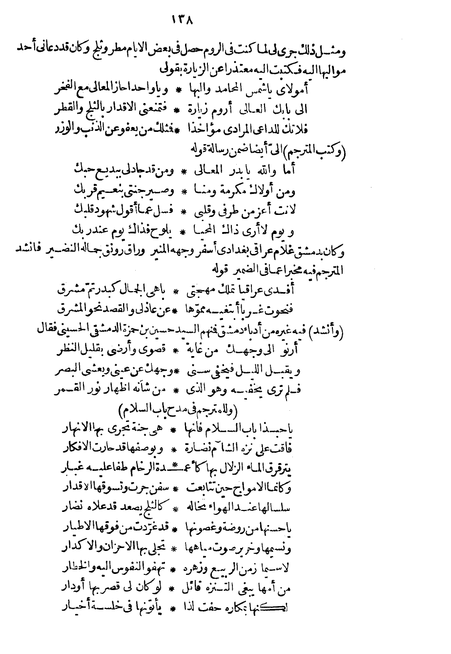 ومثل ذلك جرى لي لما كنت في الروم حصل في بعض الأيام مطر وثلج وكان قد دعاني أحد مواليها إليه فكتبت إليه معتذراً عن الزيارة بقولي