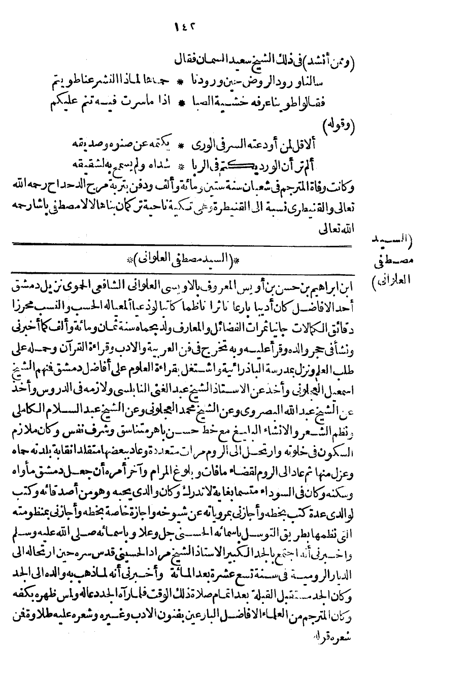 ابن إبراهيم بن حسن بن أويس المعروف بالأويسي العلواني الشافعي الحموي نزيل دمشق أحد الأفاضل كان أديباً بارعاً ناثراً ناظماً كاتباً لوذعياً ألمعياً له الحسب والنسب محرزاً دقائق الكمالات جانياً ثمرات الفضائل والمعارف ولد بحماه سنة ثمان ومائة وألف كما أخبرني ونشأ في حجر والده وقرأ عليه وبه تخرج في فن العربية والأدب وقراءة القرآن وحمله على طلب العلم ونزل بمدرسة الباذرائية واشتغل بقراءة العلوم على أفاضل دمشق فمنهم الشيخ إسمعيل العجلوني وأخذ عن الأستاذ الشيخ عبد الغني النابلسي ولازمه في الدروس وأخذ عن الشيخ عبد الله البصروي وعن الشيخ محمد العجلوني وعن الشيخ عبد السلام الكاملي ونظم الشعر والانشاء البليغ مع خط حسن باهر متناسق وشرف نفس وكان ملازم السكون في خلوته وارتحل إلى الروم مرات متعددة وعاد ببعضها متقلداً نقابة بلدته حماه وعزل منها ثم عاد إلى الروم لقضاء ما فات وبلوغ المرام وآخر أمره أن جعل دمشق مأواه وسكنه وكان في السوداء متسماً بغاية لا تدرك وكان والدي يحبه وهو من أصدقائه وكتب لوالدي عدة كتب بخطه وأجازني بمروياته عن شيوخه واجازة خاصة بخطه وأجازني بمنظومته التي نظمها بطريق التوسل بأسمائه الحسنى جل وعلا وبأسمائه صلى الله عليه وسلم وأخبرني أنه اجتمع بالجد الكبير الأستاذ الشيخ مراد الحسيني قدس سره حين ارتحاله إلى الديار الرومية في سنة تسع عشرة بعد المائة وأخبرني أنه لما ذهب به ولاده إلى الجد وكان الجد مستقبل القبلة بعد اتمام صلاة ذلك الوقت فلما رآه الجد دعا له ولمس ظهره بكفه وكان المترجم من العلماء الأفاضل البارعين بفنون الأدب وغيره وشعره عليه طلاوة فمن شعره قوله