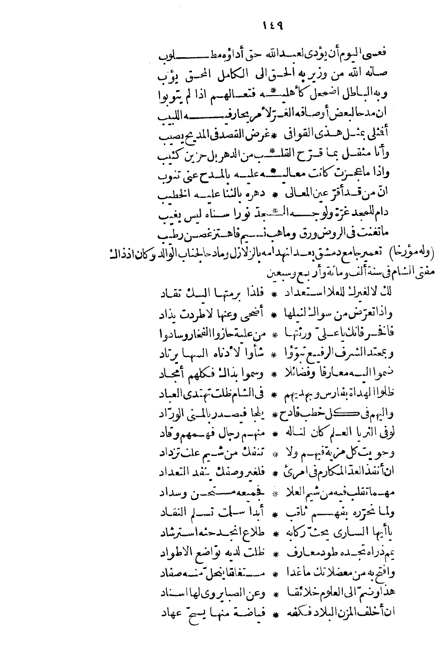 وله مؤرخاً تعمير جامع دمشق بعد انهدامه بالزلازل ومادحاً لجناب الوالد وكان إذ ذاك مفتي الشام في سنة ألف ومائة وأربع وسبعين