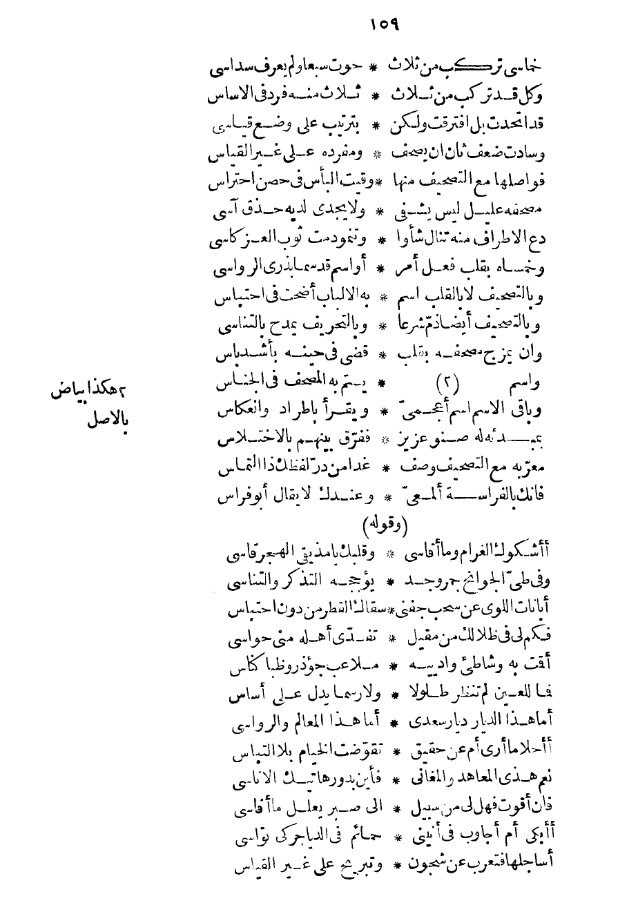 وبالتصحيف لا بالقلب اسم ... به الألباب أضحت في احتباس