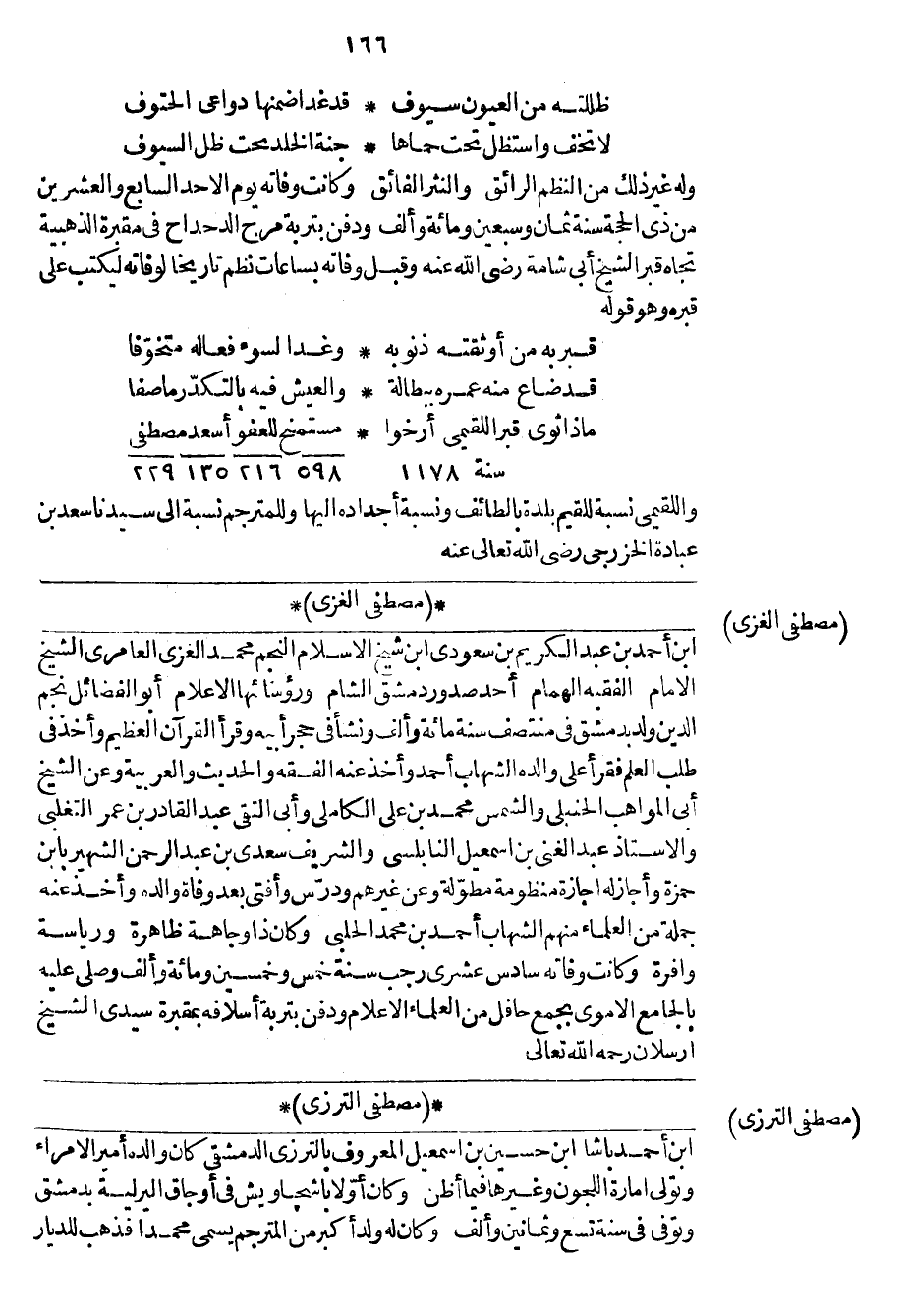 ابن أحمد بن عبد الكريم بن سعودي ابن شيخ الاسلام النجم محمد الغزي العامري الشيخ الامام الفقيه الهمام أحد صدور دمشق الشام ورؤسائها الأعلام أبو الفضائل نجم الدين ولد بدمشق في منتصف سنة مائة وألف ونشأ في حجر أبيه وقرأ القرآن العظيم وأخذ في طلب العلم فقرأ على والده الشهاب أحمد وأخذ عنه الفقه والحديث والعربية وعن الشيخ أبي المواهب الحنبلي والشمس محمد بن علي الكاملي وأبي التقى عبد القادر بن عمر التغلبي والأستاذ عبد الغني بن إسمعيل النابلسي والشريف سعدي بن عبد الرحمن الشهير بابن حمزة وأجاز له اجازة منظومة مطولة وعن غيرهم ودرس وأفتى بعد وفاة والده وأخذ عنه جملة من العلماء منهم الشهاب أحمد بن محمد الحلبي وكان ذا وجاهة ظاهرة ورياسة وافرة وكانت وفاته سادس عشري رجب سنة خمس وخمسين ومائة وألف وصلى عليه بالجامع الأموي بجمع حافل من العلماء الأعلام ودفن بتربة أسلافه بمقبرة سيدي الشيخ أرسلان رحمه الله تعالى.