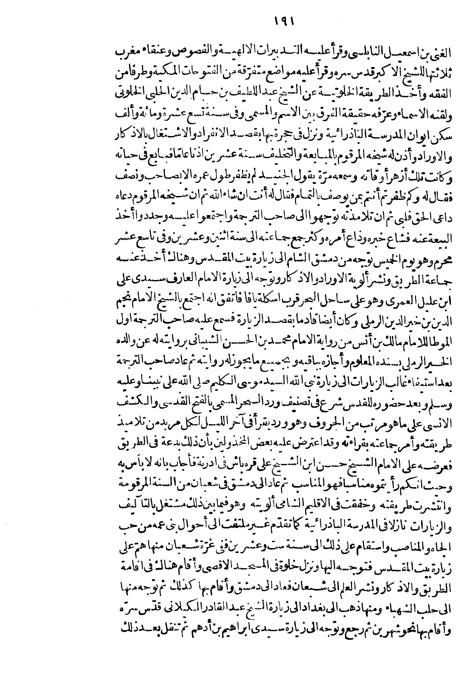 الغني بن إسمعيل النابلسي وقرأ عليه التدبيرات الألهية والفصوص وعنقاء مغرب ثلاثتها للشيخ الأكبر قدس سره وقرأ عليه مواضع متفرقة من الفتوحات المكية وطرفاً من الفقه وأخذ الطريقة الخلوتية عن الشيخ عبد اللطيف بن حسام الدين الحلبي الخلوتي ولقنه الأسماء وعرفه حقيقة الفرق بين الأسم والمسمى وفي سنة تسع عشرة ومائة وألف سكن إيوان المدرسة الباذرائية ونزل في حجرة بها بقصد الانفراد والاشتغال بالأذكار والأوراد وأذن له شيخه المرقوم بالمبايعة والتخليف سنة عشرين أذناً عاماً فبايع في حياته وكانت تلك أزهر أوقاته وسمعه مرة يقول الجنيد لم يظفر طول عمره إلا بصاحب ونصف فقال له وكم ظفرتم أنتم بمن يوصف بالتمام فقال له أنت إن شاء الله ثم إن شيخه المرقوم دعاه داعي الحق فلبي ثم إن تلامذته توجهوا إلى صاحب الترجمة واجتمعوا عليه وجددوا أخذ البيعة عنه فشاع خبره وذاع أمره وكثر جمع جماعته إلى سنة اثنين وعشرين وفي تاسع عشر محرم وهو يوم الخميس توجه من دمشق الشام إلى زيارة بيت المقدس وهناك أخذ عنه جماعة الطريق ونشر ألوية الأوراد والأذكار وتوجه إلى زيارة الامام العارف سيدي علي ابن عليل العمري وهو على ساحل البحر قرب اسكلة يافا فاتفق إنه اجتمع بالشيخ الامام نجم الدين بن خير الدين الرملي وكان أيضاً قادماً بقصد الزيارة فسمع عليه صاحب الترجمة أول الموطا للامام مالك بن أن من رواية الامام محمد بن الحسن الشيباني بروايته له عن والده الخير الرملي بسنده المعلوم وأجازه بباقيه وبجميع ما يجوز له روايته ثم عاد صاحب الترجمة بعد استيفاء غالب الزيارات إلى زيارة نبي الله السيد موسى الكليم صلى الله على نبينا وعليه وسلم وبعد حضوره للقدس شرع في تصنيف ورد السحر المسمى بالفتح القدسي والكشف الأنسي على ما هو مرتب من الحروف وهو ورد يقرأ في آخر الليل لكل مربد من تلاميذ طريقته وأمر جماعته بقراءته وقد اعترض عليه بعض المخذولين بأن ذلك بدعة في الطريق فعرضه على الامام الشيخ حسن ابن الشيخ علي قره باش في أدرنة فأجاب بأنه لا بأس به وحيث انكم رأيتموه مناسباً فهو المناسب ثم عاد إلى دمشق في شعبان من السنة المرقومة وانتشرت طريقته وخفقت في الاقليم الشامي ألويته وهو فيما بين ذلك مشتغل بالتآليف والزيارات نازلاً في المدرسة الباذرائية كما تقدم غير ملتفت إلى أحوال بني عمه من حب الجاه والمناصب واستقام على ذلك إلى سنة ست وعشرين ففي غرة شعبان منها هم على زيارة بيت المقدس فتوجه إليها ونزل خلوة في المسجد الأقصى وأقام هناك في إقامة الطريق والأذكار ونشر العلم إلى شعبان فعاد إلى دمشق وأقام بها كذلك ثم توجه منها إلى حلب الشهباء ومنها ذهب إلى بغداد إلى