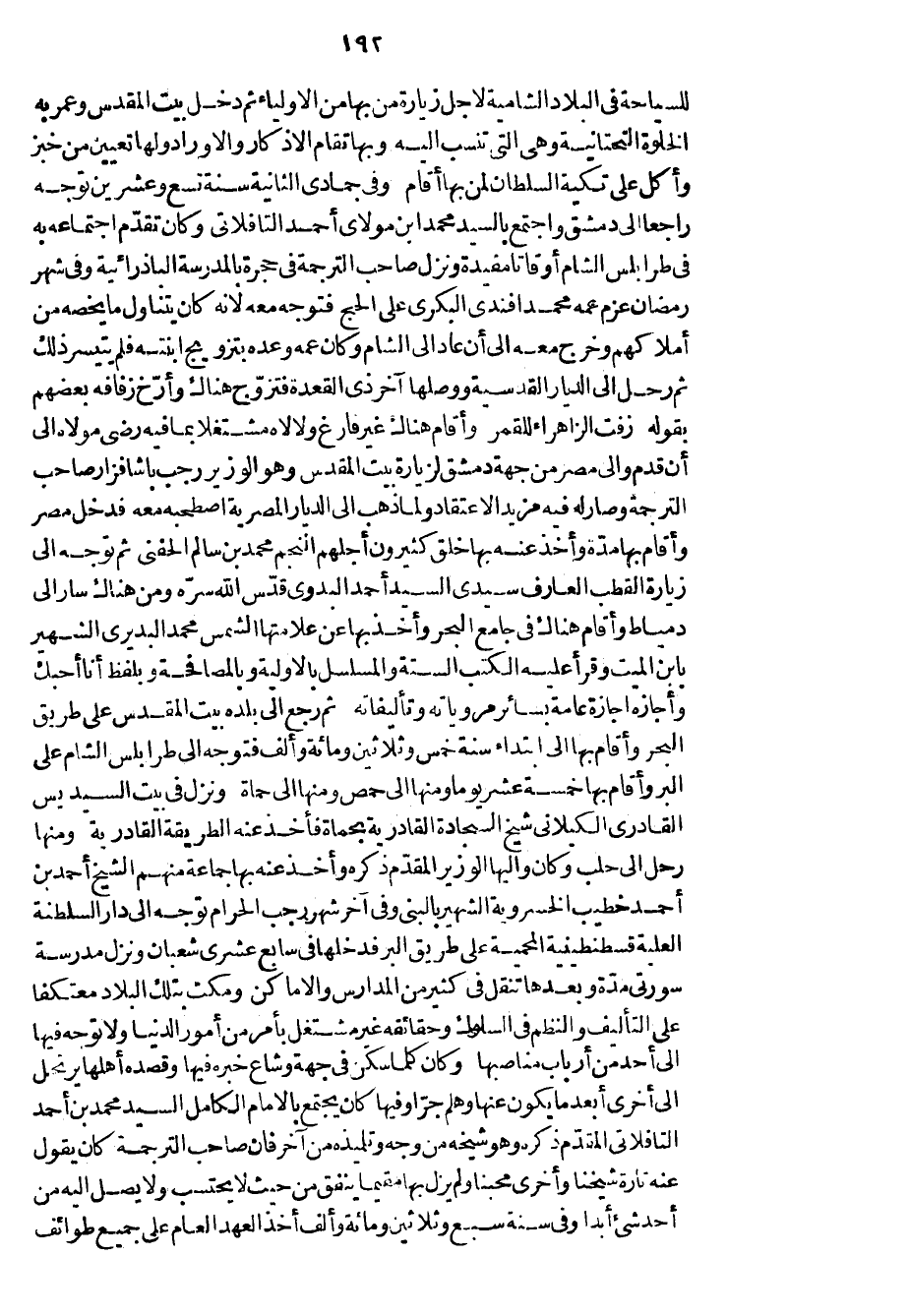 للسياحة في البلاد الشامية لأجل زيارة من بها من الأولياء ثم دخل بيت المقدس وعمر به الخلوة التحتانية وهي التي تنسب إليه وبها تقام الأذكار والأوراد ولها تعيين من خبز وأكل على تكية السلطان لمن بها أقام وفي جمادي الثانية سنة تسع وعشرين توجه راجعاً إلى دمشق واجتمع بالسيد محمد ابن مولاي أحمد التافلاتي وكان تقدم اجتماعه به في طرابلس الشام أوقاتاً مفيدة ونزل صاحب الترجمة في حجرة بالمدرسة الباذرائية وفي شهر رمضان عزم عمه محمد أفندي البكري على الحج فتوجه معه لأنه كان يتناول ما يخصه من أملاكهم وخرج معه إلى أن عاد إلى الشام وكان عمه وعده بتزويج ابنته فلم يتيسر ذلك ثم رحل إلى الديار القدسية ووصلها آخر ذي القعدة فتزوج هناك وأرخ زفافه بعضهم بقوله زفت الزاهراء للقمر وأقام هناك غير فارغ ولالاه مشتغلاً بما فيه رضي مولاه إلى أن قدم والي مصر من جهة دمشق لزيارة بيت المقدس وهو الوزير رجب باشا فزار صاحب الترجمة وصار له فيه مزيد الاعتقاد ولما ذهب إلى الديار المصرية اصطحبه معه فدخل مصر وأقام بها مدة وأخذ عنه بها خلق كثيرون أجلهم النجم محمد بن سالم الحفني ثم توجه إلى زيارة القطب العارف سيدي السيد أحمد البدوي قدس الله سره ومن هناك سار إلى دمياط وأقام هناك في جامع البحر وأخذ بها عن علامتها الشمس محمد البديري الشهير بابن الميت وقرأ عليه الكتب الستة والمسلسل بالأولية وبالمصافحة وبلفظ أنا أحبك وأجازه اجازة عامة بسائر مروياته وتأليفاته ثم رجع إلى بلده بيت المقدس على طريق البحر وأقام بها خمسة عشر يوماً ومنها إلى حمص ومنها إلى حماة ونزل في بيت السيد يس القادري الكيلاني شيخ الجادة القادرية بحماة فأخذ عنه الطريقة القادرية ومنها رحل إلى حلب وكان واليها الوزير المقدم ذكره وأخذ عنه بها جماعة منهم الشيخ أحمد بن أحمد خطيب الخسروية الشهير بالبني وفي آخر شهر رجب الحرام توجه إلى دار السلطنة العلية قسطنطينية المحمية على طريق البر فدخلها في سابع عشري شعبان ونزل مدرسة سورتي مدة وبعدها تنقل في كثير من المدارس والأماكن ومكث بتلك البلاد معتكفاً على التأليف والنظم في السلوك وحقائقه غير مشتغل بأمر من أمور الدنيا ولا توجه فيها إلى أحد من أرباب مناصبها وكان كلما سكن في جهة وشاع خبره فيها وقصده أهلها يرتحل إلى أخرى أبعد ما يكون عنها وهلم جرا وفيها كان يجتمع بالامام الكامل السيد محمد بن أحمد التافلاتي المقدم ذكره وهو شيخه من وجه وتلميذه من آخر فإن صاحب الترجمة كان يقول عنه تارة شيخنا وأخرى محبنا ولم يزل بها مقيماً ينفق من حيث لا يحتسب ولا يصل إليه من أحد شيء أبداً وفي سنة سبع وثلاثين ومائة وألف أخذ العهد العام على جميع طوائف