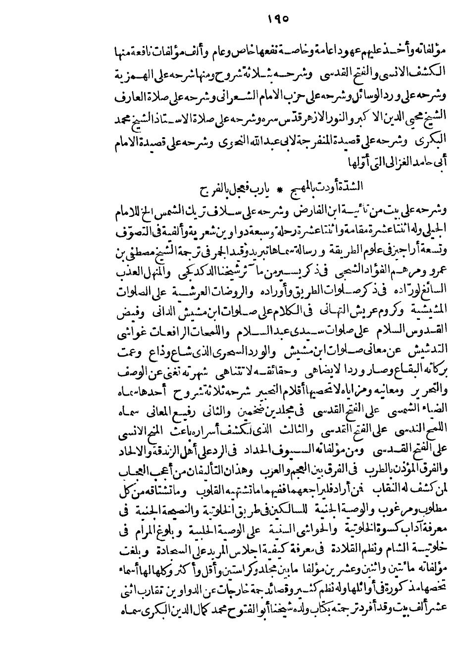 وشرحه على بيت من تائية ابن الفارض وشرحه على سلاف تريك الشمس الخ للامام الجيلي وله اثنتا عشرة مقامة واثنتا عشرة رحلة وسبعة دواوين شعرية وألفية في التصوف وتسعة أراجيز في علوم الطريقة ورسالة سماها تبريد وقيد الجمر في ترجمة الشيخ مصطفى بن عمرو ومرهم الفؤاد الشجي في ذكر يسير من مآثر شيخنا الدكدكجي والمنهل العذب السائغ لوراده في ذكر صلوات الطريق وأوراده والروضات العرشية على الصلوات المشيشية وكروم عريش التهاني في الكلام على صلوات ابن مشيش الداني وفيض القدوس السلام على صلوات سيدي عبد السلام واللمحات الرافعات غواشي التدشيش عن معاني صلوات ابن مشيش الداني وفيض القدوس السلام على صلوات سيدي عبد السلام واللمحات الرافعات غواشي التدشيش عن معاني صلوات ابن مشيش والورد السحري الذي شاع وذاع وعمت بركاته البقاع وصار ورداً لا يضاهي وحقائقه لا تتناهى شهرته تغنى عن الوصف والتحرير ومعانيه ومزاياه لا تحصيها أقلام النحبير شرحه ثلاثة شروح أحدها سماه الضياء الشمسي على الفتح القدسي في مجلدين ضخمين والثاني رفيع المعاني سماه اللمح الندسي على الفتح القدسي والثالث الذي لكشف أسراره باعث المنح الأنسي على الفتح القدسي ومن مؤلفاته السيوف الحداد في الرد على أهل الزندقة والالحاد والفرق المؤذن بالطرب في الفرق بين العجم والعرب وهذان التأليفان من أعجب العجاب لمن كشف لن النقاب فمن أراد فليراجعهما ففيهما ما تشتهيه القلوب وما تشتاقه من كل مطلوب ومرغوب والوصية الجنية للسالكين في طريق الخلوتية والنصيحة الجنية في معرفة آداب كسوة الخلوتية والحواشي السنية على الوصية الحلبية وبلوغ المرام في خلوتية الشام ونظم القلادة في معرفة كيفية اجلاس المريد على السجادة وبلغت مؤلفاته مائتين واثنين وعشرين مؤلفاً ما بين مجلد وكراستين وأقل وأكثر وكلها لها أسماء تخصها مذكورة في أوائلها وله نظم كثير وقصائد جمة خارجات عن الدواوين تقارب اثني عشر ألف بيت وقد أفرد ترجمته بكتاب ولده شيخنا أبو الفتوح محمد كمال الدين البكري سماه