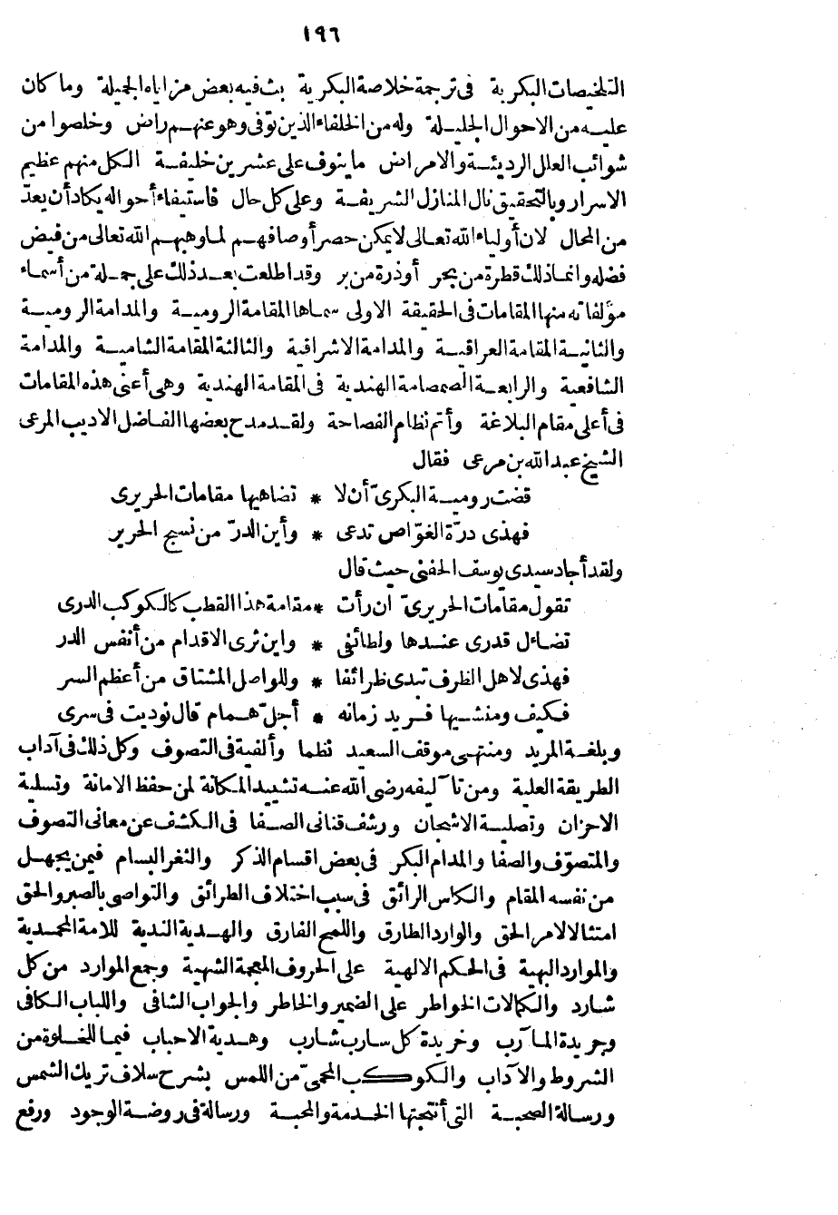 التلخيصات البكرية في ترجمة خلاصة البكرية بث فيه بعض مزاياه الجميلة وما كان عليه من الأحوال الجليلة وله من الخلفاء الذين توفي وهو عنهم راض وخلصوا من شوائب العلل الرديئة والأمراض ما ينوف على عشرين خليفة الكل منهم عظيم الأسرار وبالتحقيق نال المنازل الشريفة وعلى كل حال فاستيفاء أحواله يكاد أن يعد من المحال لأن أولياء الله تعالى لا يمكن حصر أوصافهم لما وهبهم الله تعالى من فيض فضله وإنما ذلك قطرة من بحر أو ذرة من بر وقد اطلعت بعد ذلك على جملة من أسماء مؤلفاته منها المقامات في الحقيقة الأولى سماها المقامة الرومية والمدامة الرومية والثانية المقامة العراقية والمدامة الأشرافية والثالثة المقامة الشامية والمدامة الشافعية والرابعة الصمصامة الهندية في المقامة الهندية وهي أعنى هذه المقامات في أعلى مقام البلاغة وأتم نظام الفصاحة ولقد مدح بعضها الفاضل الأديب المرعى الشيخ عبد الله بن مرعي فقال