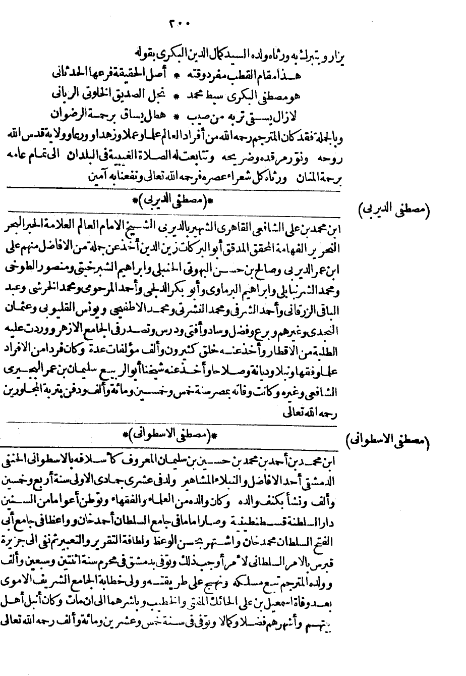 مصطفى الديربي ابن محمد علي الشافعي القاهري الشهير بالديربي الشيخ الامام العالم العلامة الحبر البحر النحرير الفهامة المحقق المدقق أبو البركات زين الدين أخذ عن جملة من الأفاضل منهم على ابن عمر الديربي وصالح بن حسن البهوتي الحنبلي وإبراهيم الشبرخيتي ومنصور الطوخي ومحمد الشرنبابلي وإبراهيم البرماوي وأبو بكر الدلجي وأحمد المرحومي ومحمد الخرشي وعبد الباقي الزرقاني وأحمد الشرفي ومحمد النشرتي ومحمد الأطفيحي ويونس القليوبي وعثمان النجدي وغيرهم وبرع وفضل وساد وأفتى ودرس وتصدر في الجامع الأزهر ووردت عليه الطلبة من الأقطار وأخذ عنه خلق كثيرون وألف مؤلفات عدة وكان فرداً من الأفراد علماً وفقهاً ونبلاً وديانة وصلاحاً وأخذ عنه شيخنا أبو الربيع سليمان بن عمر البجيرمي الشافعي وغيره وكانت وفاته بمصر سنة خمس وخمسين ومائة وألف ودفن بتربة المجاورين رحمه الله تعالى.