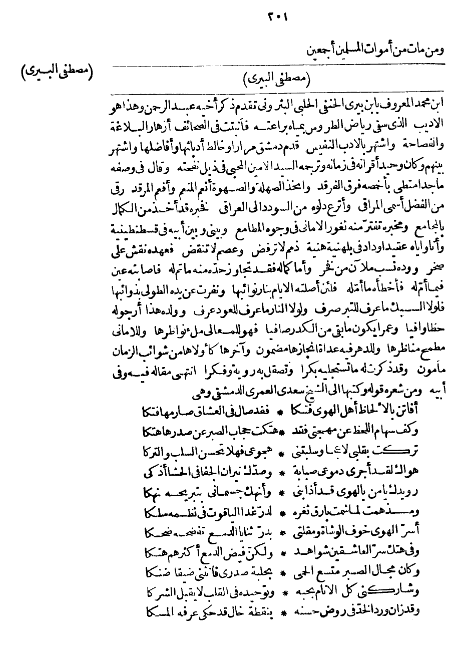 ابن محمد المعروف بابن بيري الحنفي الحلبي البثروني تقدم ذكر أخيه عبد الرحمن وهذا هو الأديب الذي سقى رياض الطروس بمياه براعته فأنبتت في الصحائف أزهار البلاغة والفصاحة واشتهر بالأدب النفيس قدم دمشق مراراً وخالط أدبائها وأفاضلها واشتهر بينهم وكان وحيد أقرانه في زمانه وترجمه السيد الأمين المحبي في ذيل نفحته وقال في وصفه ماجد امتطى بأخمصه فرق الفرقد واتخذ الصهلة والصهوة أنعم المنعم وأفعم المرقد رقى من الفضل أسمى المراقي وأترع دلوه من السؤدد إلى العراقي فخبره قد أخذ من الكمال بالمجامع ومخبره تفتر منه ثغور الأماني في وجوه المطامع وبيني وبين أبيه في قسطنطينية وأنا وإياه عقيداً وداد في بلهنية هنية ذمم لا ترفض وعصم لا تنقض فعهده نقش على صخر ووده نسب ملآن من فخر وأما كماله فقد تجاوز حده منه ما تم لم فإصابته عين فيما أم له فأخطأه ما أمله فلئن أصلته الأيام بنار نوائبها ونفرت عن يده الطولى بذوائبها فلولا السبك ما عرف للتبر صرف ولولا النار ما عرف للعود عرف وولده هذا أرجو له حظاً وافياً وعمراً يكون ما بقي من الكدر صافياً فهو للمعالي ملء نواظرها وللأماني مطمح مناظرها وللدهر فيه عداة نجازها مضمون وآخرها كأولاها من شوائب الزمان مأمون وقد ذكرت له ما تستجليه بكراً وتصقل به روية وفكراً انتهى مقاله فيه وفي أبيه ومن شعره قوله وكتبها إلى الشيخ سعدي العمري الدمشقي وهي