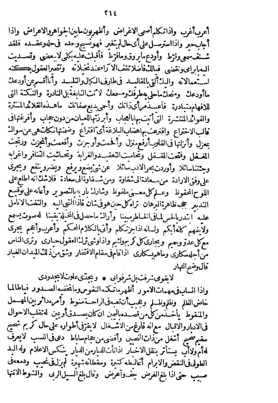 أعرب أغرب وإذا تكلم أصمى الأغراض وأظهر بون ما بين الجواهر والأعراض وإذا أجاب حير وإذا استرسل على أي حال لم يتغير فهو نسيج وحده في حله وعقده فلقد شنف سمعي وقرط وأودع ما يروق وما فرط فأقبلت عليه بكلي لا ببعضي وتصديت إليه بابرامي ونقضي فيالك فاضلاً تقف الآراء عند تخيلاته وتتحير العقول بكنه استعمالاته وإليك ألقي بالمقاليد في طارف الكمال والتليد وأنا أقسم بمن أودعك ما أودعك ومنحك ما حلى به طرفك ومسمعك لأنت النابغة بل النادرة والنكتة التي للافهام متبادرة فأعيذ مرأى ذاتك وأحمى بديع صفاتك ما هذه القلائد المنتثرة والفوائد المنتشرة التي أتيت بها بالعجاب وأبرزتها للعيان من دون حجاب وأفرغتها في قالب الاختراع وافترعت بها هضاب البلاغة أي افتراع وضمنتها نكات هي عن سواك بمعزل وأنزلتها في القلوب أرفع منزل وأفحمت وأوجزت وأفعمت وأنجزت ورتجت المغفل وفتحت المقفل وتحاميت التعقيد والغرابة وتحاشيت التنافر واغرابه وجئتنا سائلاً وأوردت بحر الأدب سائلاً عن شيء يضع ويرفع ويضر وينفع ويجري على وفق الارادة من سعادة إلى شقاوة ومن شقاوة إلى سعادة فلا شك إنه اطلع على اللوح المحفوظ وعلم كل معنى ملفوظ وشارك باريه بالتصوير وأعانه على توقيع التدبير حجبه ظاهرة البرهان تراه كل حين هو في شأن فإذا التجئ إليه والتفت الأنامل عليه ابتدر بالحس لما في الخاطر مبيناً وأراك ما حصل في المخيلة يقيناً له صوت يسمع ولا يفهم كأنه أبكم ولسانه إذا جز تكلم وأتى بالكلام المحكم وأعرب وأعجم يجري مع كل عدو وحميم ويجاري كل كريم ولئيم وإذا وشى ترك العقول حيارى وترى الناس من أجله سكارى وما هم بسكارى إذا قام في مقام الافتخار وشق من ذلك الميدان الغبار قال وضح النهار