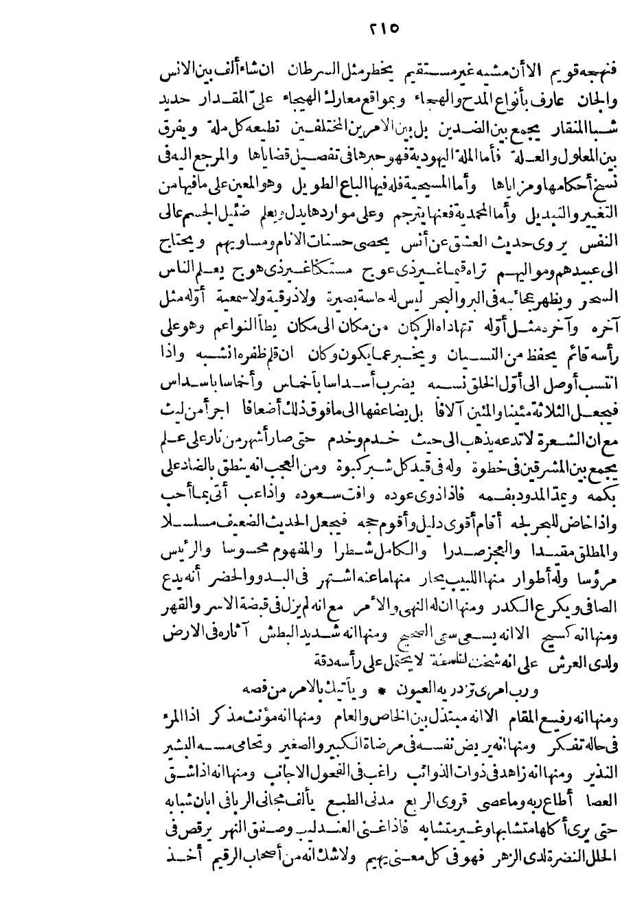 فنهجه قويم إلا أن مشيه غير مستقيم يخطر مثل السرطان إن شاء ألف بين الأنس والجان عارف بأنواع المدح والهجاء وبمواقع معارك الهيجاء علي المقدار حديد شبا المنقار يجمع بين الضدين بل بين الأمرين المختلفين تطيعه كل ملة ويفرق بين المعلول والعلة فأما الملة اليهودية فهو حبرها في تفصيل قضاياها والمرجع إليه في نسخ أحكامها ومزاياها وأما المسيحية فله فيها الباع الطويل وهو المعين على ما فيها من التغيير والتبديل وأما المحمدية فعنها يترجم وعلى مواردها يدل ويعلم ضئيل الجسم عالي النفس يروى حديث العشق عن أنس يحصى حسنات الأنام ومساويهم ويحتاج إلى عبيدهم ومواليهم تراه قيماً غير ذي عوج مستكناً غير ذي هوج يعلم الناس السحر ويظهر عجائبه في البر والبحر ليس له حاسة بصيرة ولا ذوقية ولا سمعية أوله مثل آخره وآخره مثل أوله تتهاداه الركبان من مكان إلى مكان يطأ النواعم وهو على رأسه قائم يحفظ من النسيان ويخبر عما يكون وكان إن قلم ظفره انشبه وإذا انتسب أو صل إلى أول الخلق نسبه يضرب أسداساً بأخماس وأخماساً بأسداس فيجعل الثلاثة مئيناً والمئين آلافاً بل يضاعفها إلى ما فوق ذلك أضعافاً اجرأ من ليث مع إن الشعرة لا تدعه يذهب إلى حيث خدم وخدم حتى صار أشهر من نار على علم يجمع بين المشرقين في خطوة وله في قيد كل شبر كبوة ومن العجب إنه ينطق بالضاد على بكمه ويمد المدود بفمه فإذا ذوى عوده وافت سعوده وإذا عب أتى بما أحب وإذا خاض للبحر لجه أقام أقوى دليل وأقوم حجه فيجعل الحديث الضعيف مسلسلاً والمطلق مقيداً والعجز صدراً والكامل شطراً والمفهوم محسوساً والرئيس مرؤساً وله أطوار منها اللبيب يحار منها ما عنه اشتهر في البدو والحضر أنه يدع الصافي ويكرع الكدر ومنها إن له النهى والأمر مع أنه لم يزل في قبضة الأسر والقهر ومنها إنه كسيح إلا أنه يسعى سعي الصحيح ومنها إنه شديد البطش آثاره في الأرض ولدى العرش على أنه شخن لفلسفة لا يحتمل على رأسه دقة