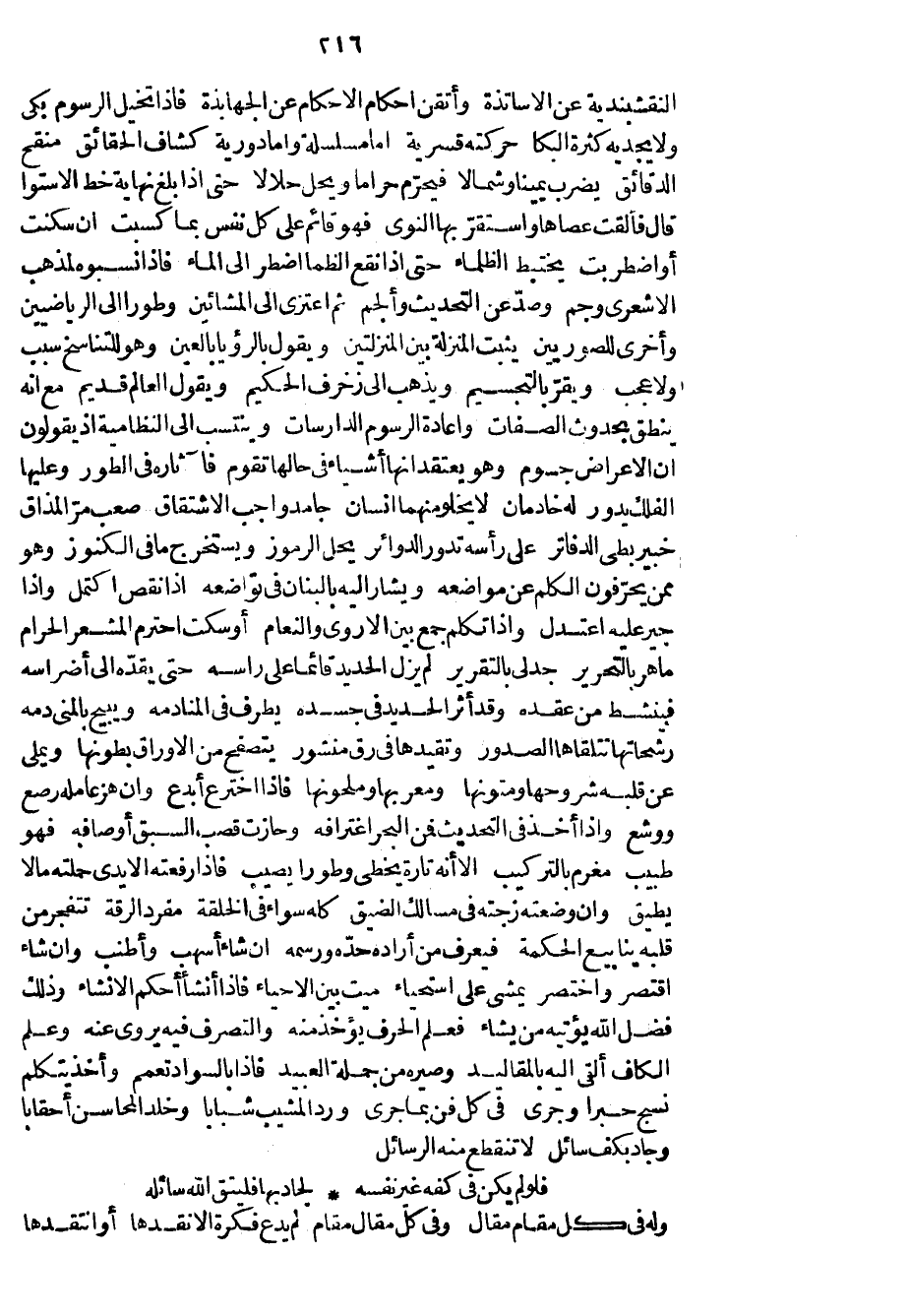 النقشبندية عن الأساتذة وأتقن أحكام الأحكام عن الجهابذة فإذا تخيل الرسوم بكى ولا يجديه كثرة البكا حركته قسرية أما مسلسلة وأما دورية كشاف الحقائق منقح الدقائق يضرب يميناً وشمالاً فيحرم حراماً ويحل حلالاً حتى إذا بلغ نهاية خط الأستوا قال فألقت عصاها واستقر بها النوى فهو قائم على كل نفس بما كسبت إن سكنت أو اضطربت يختبط الظلماء حتى إذا نقع الظما اضطر إلى الماء فإذا نسبوه لمذهب الأشعري وجم وصد عن التحديث وألجم ثم اعتزى إلى المشائين وطوراً إلى الرياضيين وأخرى للصوريين يثبت المنزلة بين المنزلتين ويقول بالرؤيا بالعين وهو للتناسخ سبب ولا عجب ويقر بالتجسيم ويذهب إلى زخرف الحكيم ويقول العالم قديم مع إنه ينطق بحدوث الصفات وإعادة الرسوم الدراسات وينتسب إلى النظامية إذ يقولون إن الأعراض جسوم وهو يعتقد إنها أشياء في حالها تقوم فآثاره في الطور وعليها الفلك يدور له خادمان لا يخلو منهما انسان جامد واجب الاشتقاق صعب مر المذاق خبير بطي الدفاتر على رأسه تدور الدوائر يحل الرموز ويستخرج ما في الكنوز وهو ممن يحرفون الكلم عن مواضعه ويشار إليه بالبنان في تواضعه إذا نقص اكتمل وإذا جير عليه اعتدل وإذا تكلم جمع بين الأروى والنعام أو سكت احترم المشعر الحرام ماهر بالتحرير جدلي بالتقرير لم يزل الحديد قائماً على رأسه حتى يقده إلى أضراسه فينشط من عقده وقد أثر الحديد في جسده يطرف في المنادمة ويبيح بالمنى دمه رشحاتها تتلقاها الصدور وتقيدها في رق منشور يتصفح من الأوراق بطونها ويملي عن قلبه شروحها ومتونها ومعربها وملحونها فإذا اخترع أبدع وإن هز عامله رصع ووشع وإذا أخذ في التحديث فمن البحر اغترافه وحازت قصب السبق أوصافه فهو طبيب مغرم بالتركيب إلا أنه تارة يخطي وطوراً يصيب فإذا رفعته الأيدي حملته ما لا يطيق وإن وضعته زجته في مسالك الضيق كله سواء في الخلقة مفرد الرقة تتفجر من قلبه ينابيع الحكمة فيعرف من أراده حده ورسمه إن شاء أسهب وأطنب وإن شاء اقتصر واختصر يمشي على استحياء ميت بين الأحياء فإذا أنشأ أحكم الانشاء وذلك فضل الله يؤتيه من يشاء فعلم الحرف يؤخذ منه والتصرف فيه يروى عنه وعلم الكاف ألقى إليه بالمقاليد وصيره من جملة العبيد فإذا بالسواد تعمم وأخذ يتكلم نسج حبراً وجرى في كل فن بما جرى ورد المشيب شباباً وخلد المحاسن أحقاباً وجاد بكف سائل لا تنقطع منه الرسائل