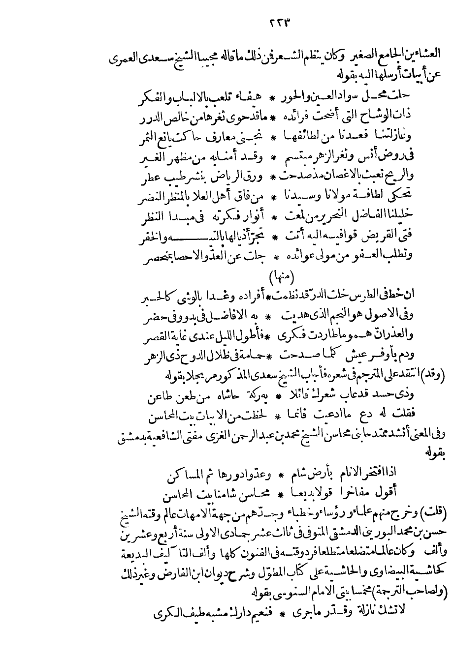 قلت وخرج منهم علماء ورؤساء وخطباء وجدهم من جهة الأمهات عالم وقته الشيخ حسن بن محمد البوريني الدمشقي المتوفي في ثالث عشر جمادي الأولى سنة أربع وعشرين وألف وكان عالماً متضلعاً متطلعاً فرد وقته في الفنون كلها وألف التآليف البديعة كحاشية البيضاوي والحاشية على كتاب المطول وشرح ديوان ابن الفارض وغير ذلك ولصاحب الترجمة مخمساً بيتي الإمام السنوسي بقوله