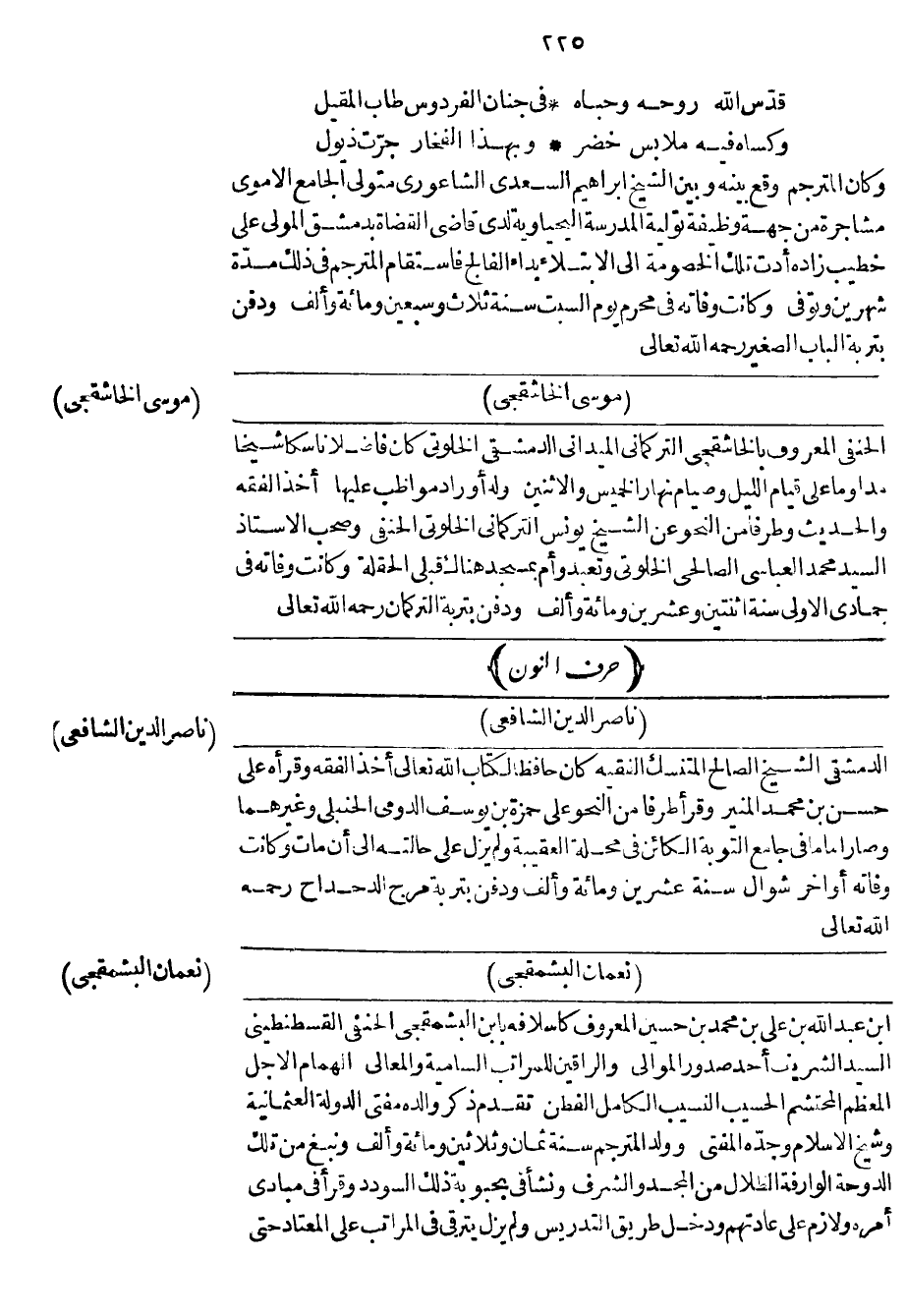 الحنفي المعروف بالخاشقجي التركماني الميداني الدمشقي الخلوتي كان فاضلاً ناسكاً شيخاً مداوماً على قيام الليل وصيام نهار الخميس والاثنين وله أوراد مواظب عليها أخذ الفقه والحديث وطرفاً من النحو عن الشيخ يونس التركماني الخلوتي الحنفي وصحب الأستاذ السيد محمد العباسي الصالحي الخلوتي وتعبد وأم بمسجد هناك قبلي الحقلة وكانت وفاته في جمادي الأولى سنة اثنتين وعشرين ومائة وألف ودفن بتربة التركمان رحمه الله تعالى