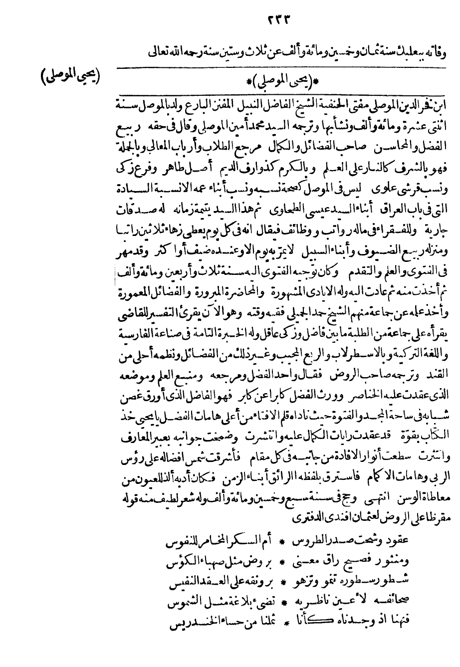ابن فخر الدين الموصلي مفتي الحنفية الشيخ الفاضل النبيل المفنن البارع ولد بالموصل سنة اثنتي عشرة ومائة وألف ونشأ بها وترجمه السيد محمد أمين الموصلي وقال في حقه ربيع الفضل والمحاسن صاحب الفضائل والكمال مرجع الطلاب وأرباب المعالي وبالجملة فهو بالشرف كالنار على العلم وبالكرم كذوارف الديم أصل طاهر وفرع زكي ونسب قرشي علوي ليس في الموصل كصحة نسبه ونسب أبناء عمه إلا نسبة السيادة التي في باب العراق أبناء السيد عيسى الطحاوي ثم هذا السيد يتيمة زمانه له صدقات جارية وللفقراء في ماله رواتب ووظائف فيقال إنه في كل يوم يعطى زهاء ثلاثين راتباً ومنزله ربيع الضيوف وأبناء السبيل لا يمر به يوم إلا وعنده ضيف أو أكثر وقد مهر في الفتوى والعلم والتقدم وكان توجيه الفتوى إليه سنة ثلاث وأربعين ومائة وألف ثم أخذت منه ثم عادت إليه وله الأيادي المشهورة والمحاضرة المبرورة والفضائل المعمورة وأخذ علمه عن جماعة منهم الشيخ حمد الجميلي فقيه وقته وهو الآن يقرئ التفسير للقاضي يقرأه على جماعة من الطلبة ما بين فاضل وزكي عاقل وله الخبرة التامة في صناعة الفارسية واللغة التركية وبالاسطرلاب والربع المجيب وغير ذلك من الفضائل ونظمه أحلى من القند وترجمه صاحب الروض فقال واحد الفضل ومرجعه ومنبع العلم وموضعه الذي عقدت عليه الخناصر وورث الفضل كابراً عن كابر فهو الفاضل الذي أورق غصن شبابه في ساحة المجد والفتوة حيث ناداه قلم الافتاء من أعلى هامات الفضل يا يحيى خذ الكتاب بقوة قد عقدت رايات الكمال عليه وانتشرت وضمخت جوانبه بعبير المعارف وانتثرت سطعت أنوار الافادة من جانبه في كل مقام فأشرقت شمس أفضاله على رؤس الربى وهامات الأكمام فاسترق بلفظه الرائق أبناء الزمن فكان أدبه ألذ للعيون من معاطاة الوسن انتهى وحج في سنة سبع وخمسين ومائة وألف وله شعر لطيف منه قوله مقرظاً على الروض لعثمان أفندي الدفتري
