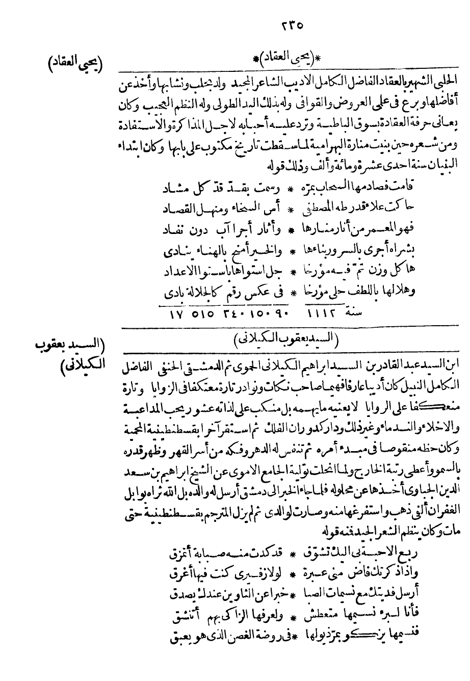 ابن السيد عبد القادر بن السيد إبراهيم الكيلاني الحموي ثم الدمشقي الحنفي الفاضل الكامل النبيل كان أديباً عارفاً فهيماً صاحب نكات ونوادر تارة معتكفاً في الزوايا وتارة منعكفاً على الروايا لا يعنيه ما يهمه بل منكب على لذاته عشور يحب المداعبة والأخلاء والندماء وغير ذلك ودار كدوران الفلك ثم استقر آخراً بقسطنطينية المحمية وكان حظه منقوصاً في مبدء أمره ثم تنفس له الدهر وفكه من أسر القهر وظهر قدره بالسمو وأعطى رتبة الخارج ولما انحلت تولية الجامع الأموي عن الشيخ إبراهيم بن سعد الدين الجباوي أخذها عن محلوله فلما جاء الخبر إلى دمشق أرسل له والده بل الله ثراه بوابل الغفران ألفى ذهب واستفرغها منه وصارت لوالدي ثم لم يزل المترجم بقسطنطينية حتى مات وكان ينظم الشعر الجيد فمنه قوله