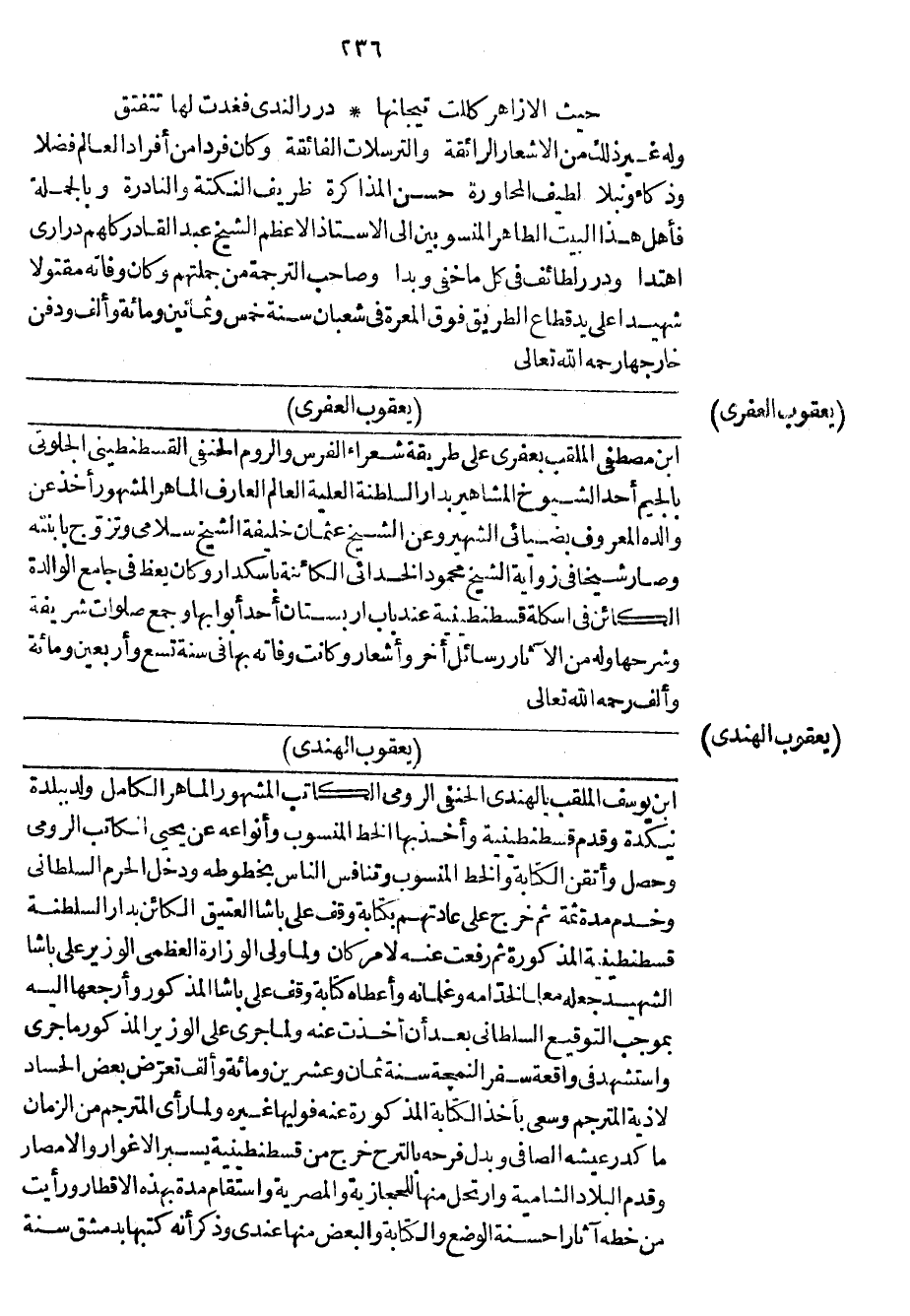 ابن يوسف الملقب بالهندي الحنفي الرومي الكاتب المشهور الماهر الكامل ولد ببلدة نيكدة وقدم قسطنطينية وأخذ بها الخط المنسوب وأنواعه عن يحيى الكاتب الرومي وحصل وأتقن الكتابة والخط المنسوب وتنافس الناس بخطوطه ودخل الحرم السلطاني وخم مدة ثمة ثم خرج على عادتهم بكتابة وقف علي باشا العتيق الكائن بدار السلطنة قسطنطينية المذكورة ثم رفعت عنه لأمر كان ولما ولي الوزارة العظمى الوزير علي باشا الشهيد جعله معلماً لخدامه وغلمانه وأعطاه كتابة وقف علي باشا المذكور وأرجعها إليه بموجب التوقيع السلطاني بعد أن أخذت عنه ولما جرى على الوزير المذكور ما جرى واستشهد في واقعة سفر النمجة سنة ثمان وعشرين ومائة وألف تعرض بعض الحساد لأذية المترجم وسعى بأخذ الكتابة المذكورة عنه فوليها غيره ولما رأى المترجم من الزمان ما كدر عيشه الصافي وبدل في فرحه بالترح خرج من قسطنطينية يسبر الأغوار والأماصر وقدم البلاد الشامية وارتحل منها للحجازية والمصرية واستقام مدة بهذه الأقطار ورأيت من خطه آثار حسنة الوضع والكتابة والبعض منها عندي وذكر أنه كتبها بدمشق سنة