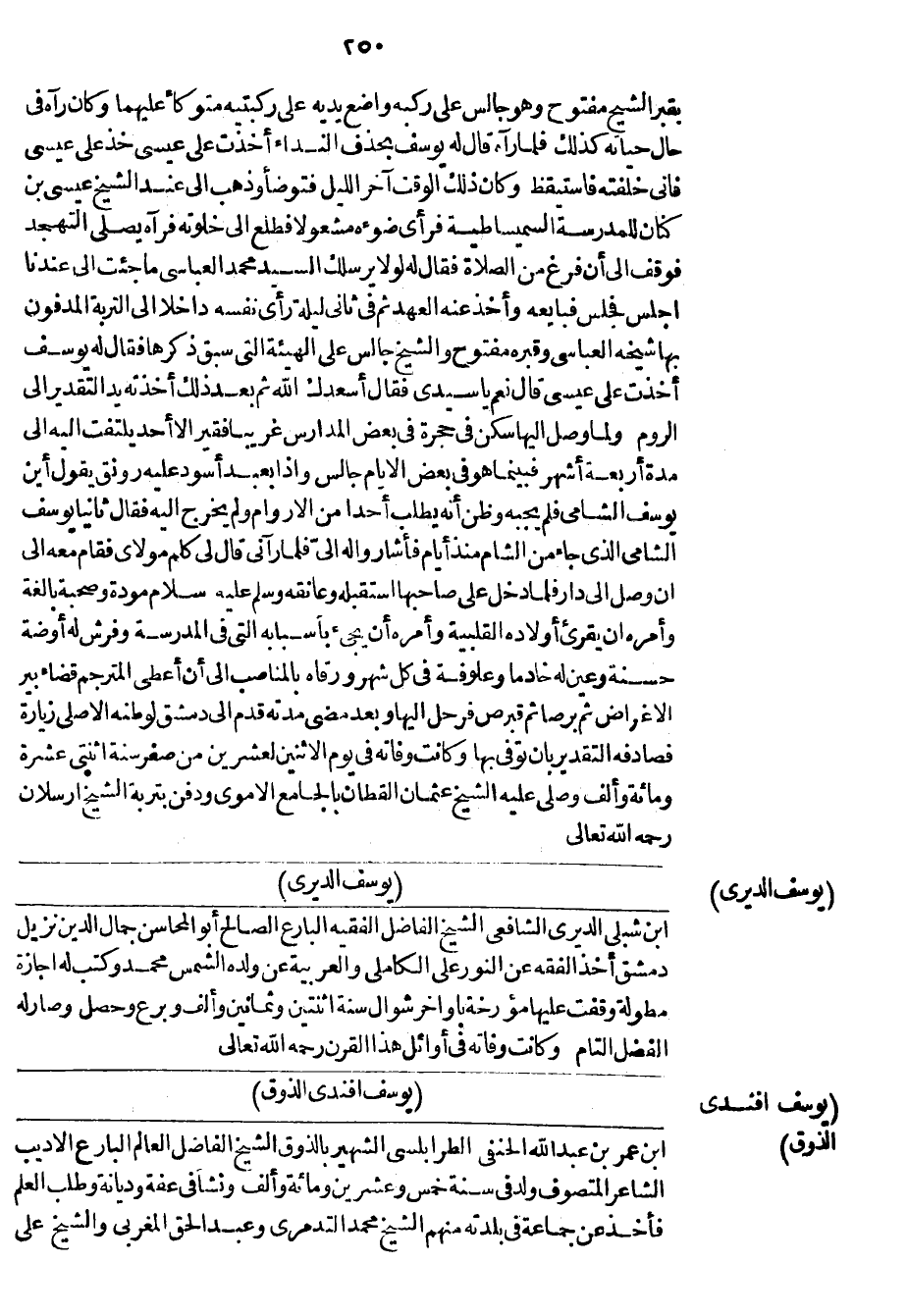 بقبر الشيخ مفتوح وهو جالس على ركبه واضع يديه على ركبتيه متوكأ عليهما وكان رآه في حال حياته كذلك فلما رآه قال له يوسف بحذف النداء أخذت علي عيسى خذ علي عيسى فإني خلفته فاستيقظ وكان ذلك الوقت آخر الليل فتوضأ وذهب إلى عند الشيخ عيسى بن كنان للمدرسة السميساطية فرأى ضوءه مشعولاً فطلع إلى خلوته فرآه يصلي التهجد فوقف إلى أن فرغ من الصلاة فقال له لولا يرسلك السيد محمد العباسي ما جئت إلى عندنا اجلس فجلس فبايعه وأخذ عنه العهد ثم في ثاني ليلة رأى نفسه داخلاً إلى التربة المدفون بها شيخه العباسي وقبره مفتوح والشيخ جالس على الهيئة التي سبق ذكرها فقال له يوسف أخذت علي عيسى قال نعم يا سيدي فقال أسعدك الله ثم بعد ذلك أخذته يد التقدير إلى الروم ولما وصل إليها سكن في حجرة في بعض المدارس غريباً فقيراً لا أحد يلتفت إليه إلى مدة أربعة أشهر فبينما هو في بعض الأيام جالس وإذا بعبد أسود عليه رونق يقول أين يوسف الشامي فلم يجبه وظن أنه يطلب أحداً من الأروام ولم يخرج إليه فقال ثانياً يوسف الشامي الذي جاء من الشام منذ أيام فأشاروا له إلي فلما رآني قال لي كلم مولاي فقام معه إلى أن وصل إلى دار فلما دخل على صاحبها استقبله وعانقه وسلم عليه سلام مودة وصحبة بالغة وأمره أن يقرئ أولاده القلبية وأمره أن يجئ بأسبابه التي في المدرسة وفرش له أوضة حسنة وعين له خادماً وعلوفة في كل شهر ورقاه بالمناصب إلى أن أعطى المترجم قضاء بير الأغراض ثم برصا ثم قبرص فرحل إليها وبعد مضي مدته قدم إلى دمشق لوطنه الأصلي زيارة فصادفه التقدير بأن توفي بها وكانت وفاته في يوم الأثنين لعشرين من صفر سنة اثنتي عشرة ومائة وألف وصلى عليه الشيخ عثمان القطان بالجامع الأموي ودفن بتربة الشيخ أرسلان رحمه الله تعالى.