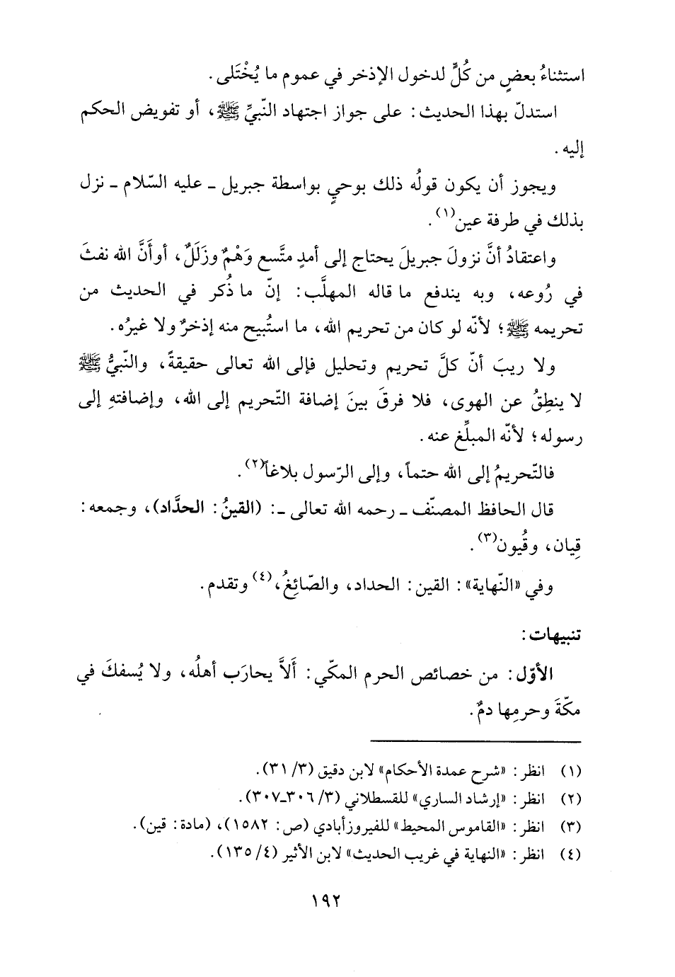واعتقادُ أنَّ نزول جبريلَ يحتاج إلى أمدٍ متَّسع وَهْمٌ وزَلَلٌ، أو أَنَّ اللَّه نفثَ في رُوعه، وبه يندفع ما قاله المهلَّب: إنّ ما ذُكر في الحديث من تحريمه -صلى اللَّه عليه وسلم-؛ لأنّه لو كان من تحريم اللَّه، ما استُبيح منه إذخر ولا غيرُه.