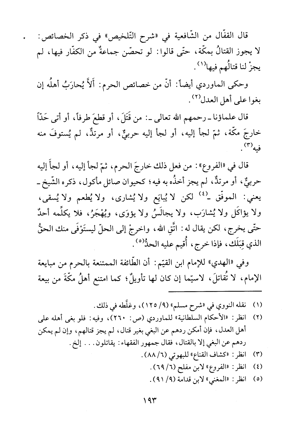 وفي "الهدي" للإمام ابن القيّم: أن الطّائفة الممتنعة بالحرم من مبايعة الإمام، لا تُقاتلَ، لاسيّما إن كان لها تأويلٌ؛ كما امتنع أهلُ مكّةَ من بيعة