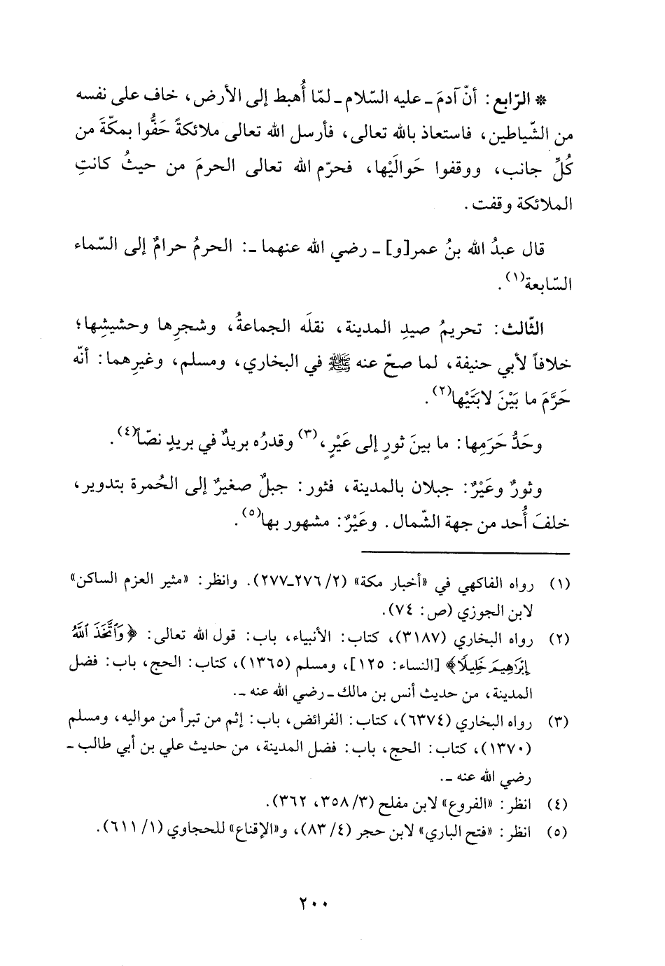 الثّالث: تحريمُ صيدِ المدينة، نقلَه الجماعةُ، وشجرِها وحشيشِها؛ خلافًا لأبي حنيفة، لما صحّ عنه -صلى اللَّه عليه وسلم- في البخاري، ومسلم، وغيرِهما: أنّه حَرَّمَ ما بَيْنَ لابَتَيْها (٢).