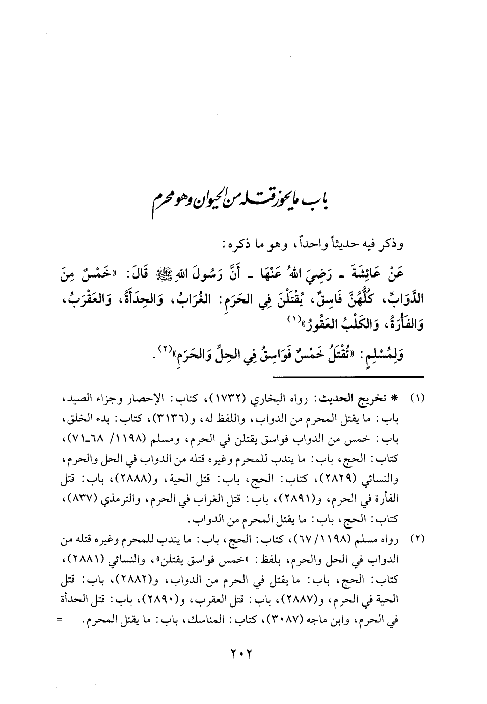 (٢) رواه مسلم (١١٩٨/ ٦٧)، كتاب: الحج، باب: ما يندب للمحرم وغيره قتله من الدواب في الحل والحرم، بلفظ: "خمس فواسق يقتلن"، والنسائي (٢٨٨١)، كتاب: الحج، باب: ما يقتل في الحرم من الدواب، و (٢٨٨٢)، باب: قتل الحية في الحرم، و (٢٨٨٧)، باب: قتل العقرب، و (٢٨٩٠)، باب: قتل الحدأة في الحرم، وابن ماجه (٣٠٨٧)، كتاب: المناسك، باب: ما يقتل المحرم. =