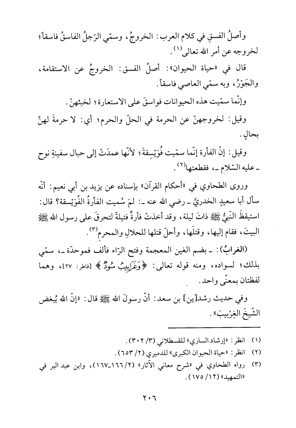 وروى الطحاوي في "أحكام القرآن" بإسناده عن يزيد بن أبي نعيم: أنّه سأل أبا سعيدٍ الخدريَّ -رضي اللَّه عنه-: لمَ سُميت الفأرةُ الفُوَيْسقة؟ قال: استيقظَ النّبيُّ -صلى اللَّه عليه وسلم- ذاتَ ليلة، وقد أخذتْ فأرة فتيلةً لتحرقَ على رسول اللَّه -صلى اللَّه عليه وسلم- البيتَ، فقام إليها، وقتلَها، وأحلّ قتلها للحلالِ والمحرمِ (٣).