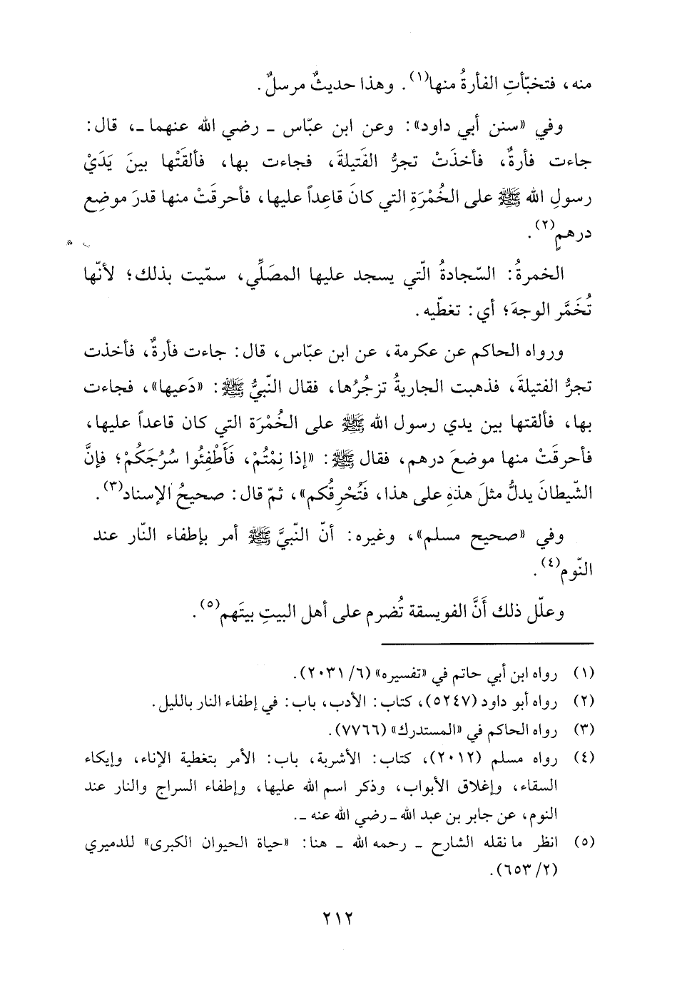 ورواه الحاكم عن عكرمة، عن ابن عبّاس، قال: جاءت فأرةٌ، فأخذت تجرُّ الفتيلةَ، فذهبت الجاريةُ تزجُرُها، فقال النّبيُّ -صلى اللَّه عليه وسلم-: "دَعيها"، فجاءت بها، فألقتها بين يدي رسول اللَّه -صلى اللَّه عليه وسلم- على الخُمْرَة التي كان قاعدًا عليها، فأحرقَتْ منها موضعَ درهم، فقال -صلى اللَّه عليه وسلم-: "إذا نِمْتُمْ، فَأَطْفِئُوا سُرُجَكُمْ؛ فإنَّ الشّيطانَ يدلُّ مثلَ هذهِ على هذا، فتحْرِقُكم"، ثمّ قال: صحيحُ الإسناد (٣).
