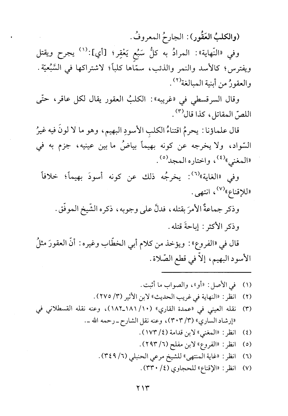 قال في "الفروع": ويؤخذ من كلام أبي الخطّاب وغيره: أنّ العقورَ مثلُ الأسود البهيم، إلّا في قطع الصّلاة.