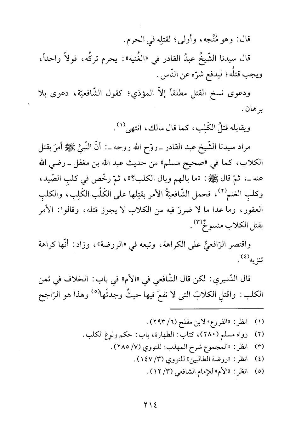 مراد سيدنا الشّيخ عبد القادر -روّح اللَّه روحه-: أنّ النّبيَّ -صلى اللَّه عليه وسلم- أمرَ بقتل الكلاب، كما في "صحيح مسلم" من حديث عبد اللَّه بن مغفل -رضي اللَّه عنه-، ثمّ قال -صلى اللَّه عليه وسلم-: "ما بالهم وبال الكلب؟ "، ثمّ رخّص في كلبِ الصّيد، وكلبِ الغنم (٢)، فحمل الشّافعيّةُ الأمر بقتِلها على الكَلْب الكَلِب، والكلبِ العقور، وما عدا ما لا ضررَ فيه من الكلاب لا يجوز قتله، وقالوا: الأمر بقتل الكلاب منسوخٌ (٣).
