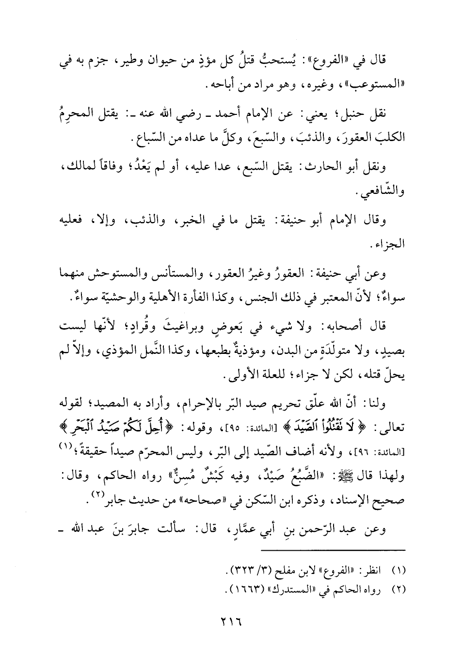 ولنا: أنّ اللَّه علّق تحريم صيد البّر بالإحرام، وأراد به المصيد؛ لقوله تعالى: {لَا تَقْتُلُوا الصَّيْدَ} [المائدة: ٩٥]، وقوله: {أُحِلَّ لَكُمْ صَيْدُ الْبَحْرِ} [المائدة: ٩٦]، ولأنه أضاف الصّيد إلى البّر، وليس المحرّم صيدًا حقيقةً؛ (١) ولهذا قال -صلى اللَّه عليه وسلم-: "الضَّبُعُ صَيْدٌ، وفيه كَبْشٌ مُسِنٌّ" رواه الحاكم، وقال: صحيح الإسناد، وذكره ابن السّكن في "صحاحه" من حديث جابر (٢).