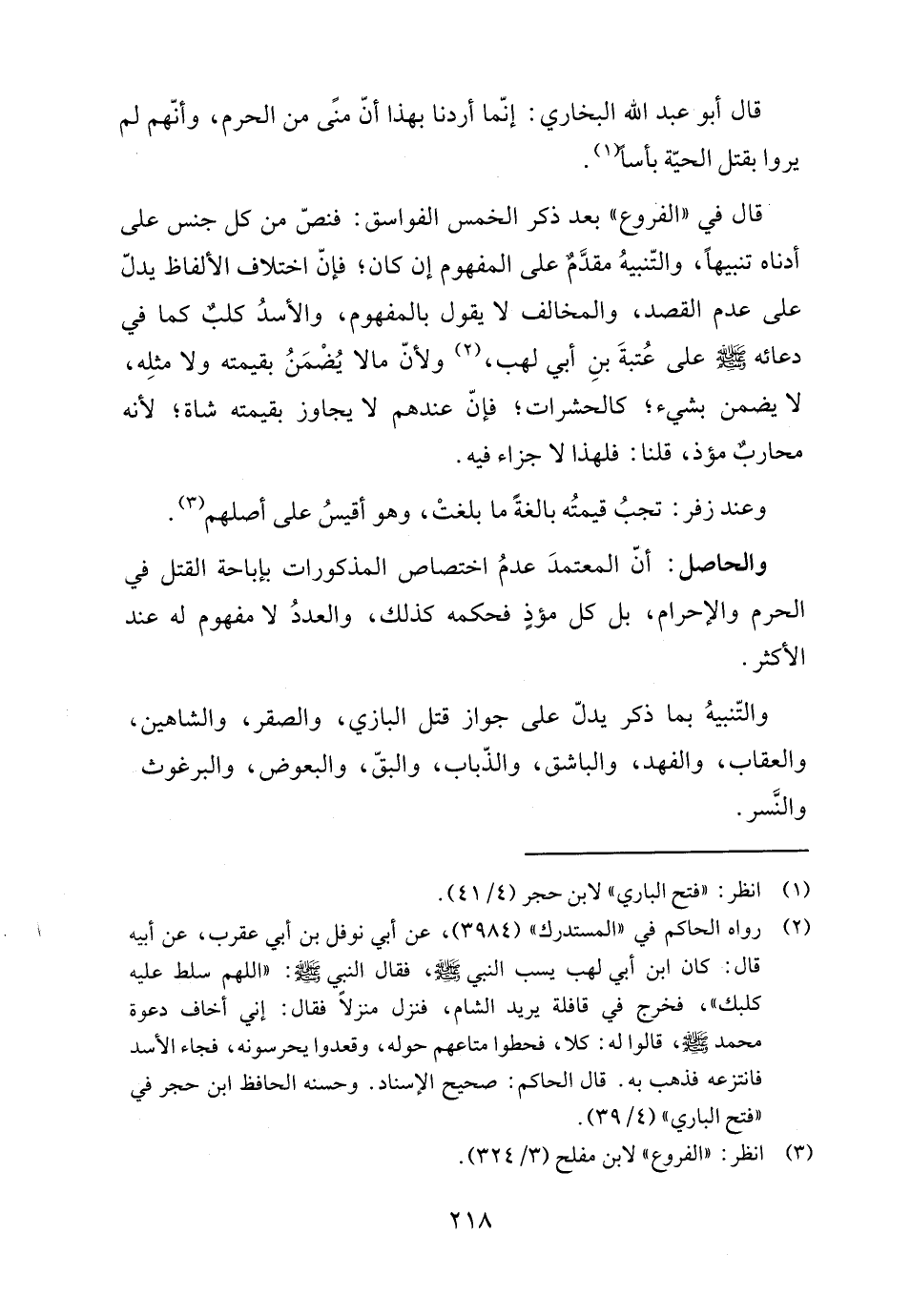 قال في "الفروع" بعد ذكر الخمس الفواسق: فنصّ من كل جنس على أدناه تنبيهًا، والتّنبيهُ مقدَّم على المفهوم إن كان؛ فإنّ اختلاف الألفاظ يدلّ على عدم القصد، والمخالف لا يقول بالمفهوم، والأسدُ كلبٌ كما في دعائه -صلى اللَّه عليه وسلم- على عُتبةَ بنِ أبي لهب، (٢) ولأنّ ما لا يُضْمَنُ بقيمته ولا مثلِه، لا يضمن بشيء؛ كالحشرات؛ فإنّ عندهم لا يجاوز بقيمته شاة؛ لأنه محاربٌ مؤذ، قلنا: فلهذا لا جزاء فيه.
