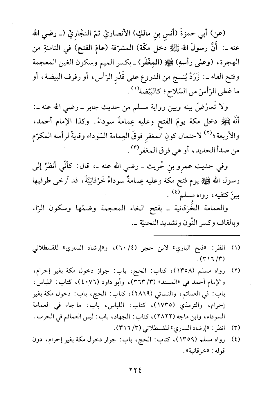 وفي حديث عمرِو بنِ حُريث -رضي اللَّه عنه-، قال: كأنّي أنظرُ إلى رسول اللَّه -صلى اللَّه عليه وسلم- يوم فتح مكة وعليه عِمامةٌ سوداءُ خَرْقانِيَّةٌ، قد أرخى طرفيها بينَ كتفيه، رواه مسلم (٤).