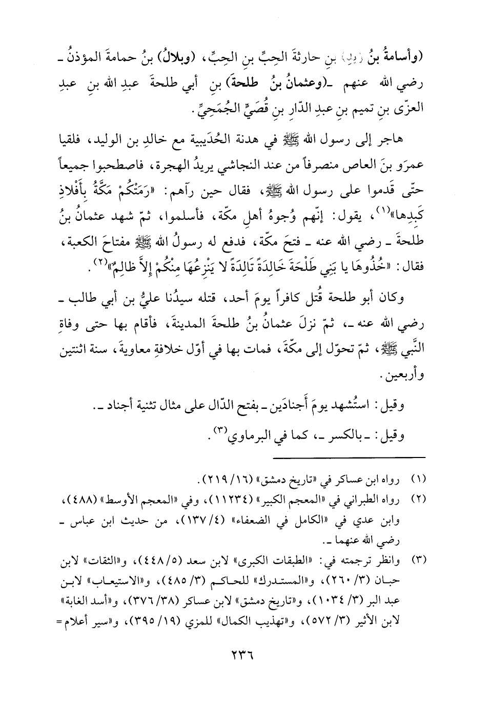 (وأسامةُ بنُ زيد) بنِ حارثةَ الحِبِّ بنِ الحِبِّ، (وبلالُ) بنُ حمامةَ المؤذنُ -رضي اللَّه عنهم- (وعثمانُ بنُ طلحةَ) بنِ أبي طلحةَ عبدِ اللَّه بنِ عبدِ العزّى بنِ تميم بنِ عبدِ الدّارِ بنِ قُصَيٍّ الجُمَحِيِّ.