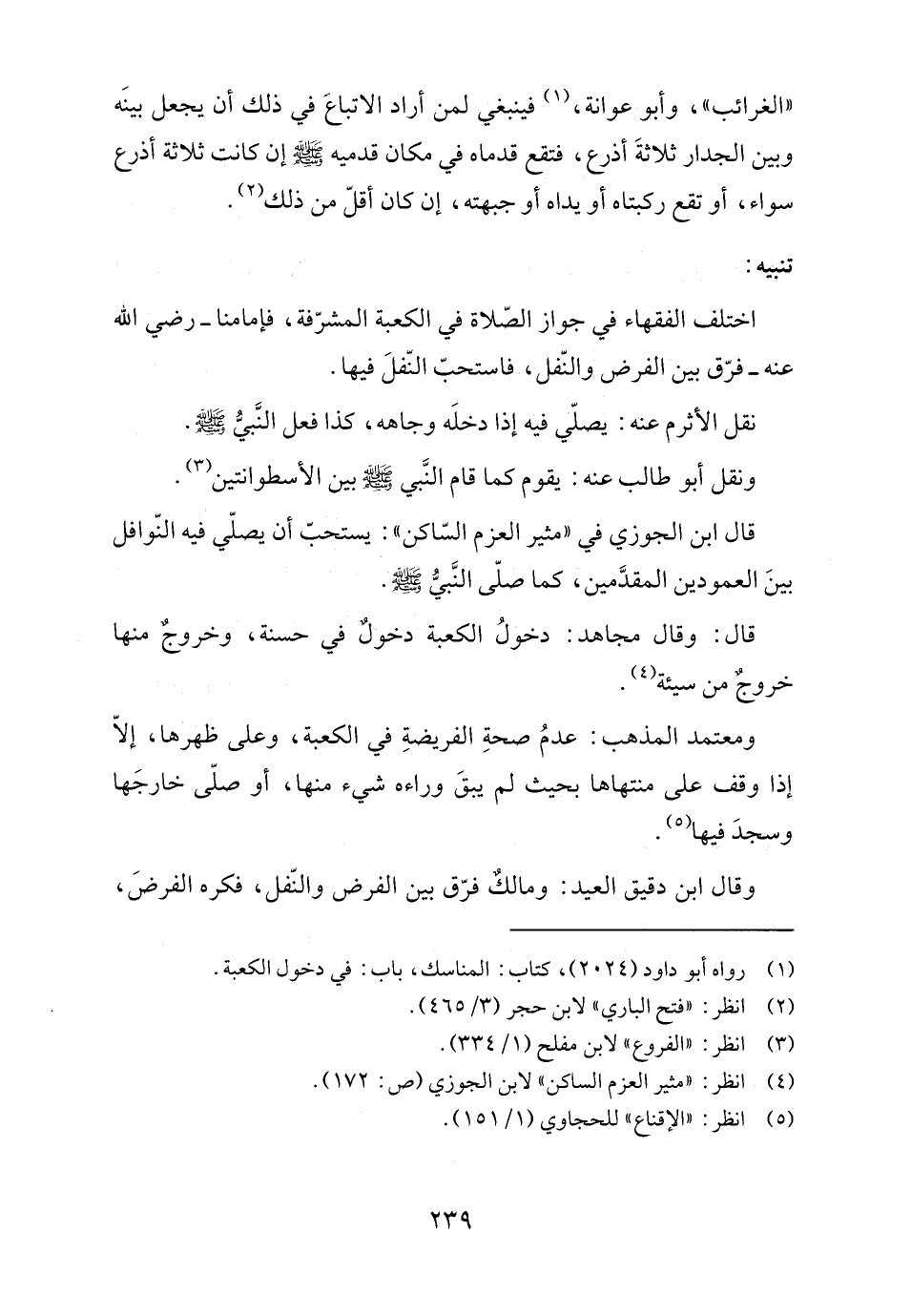 "الغرائب"، وأبو عوانة، (١) فينبغي لمن أراد الاتباعَ في ذلك أن يجعل بينَه وبين الجدار ثلاثةَ أذرع، فتقع قدماه في مكان قدميه -صلى اللَّه عليه وسلم- إن كانت ثلاثة أذرع سواء، أو تقع ركبتاه أو يداه أو جبهته، إن كان أقلّ من ذلك (٢).