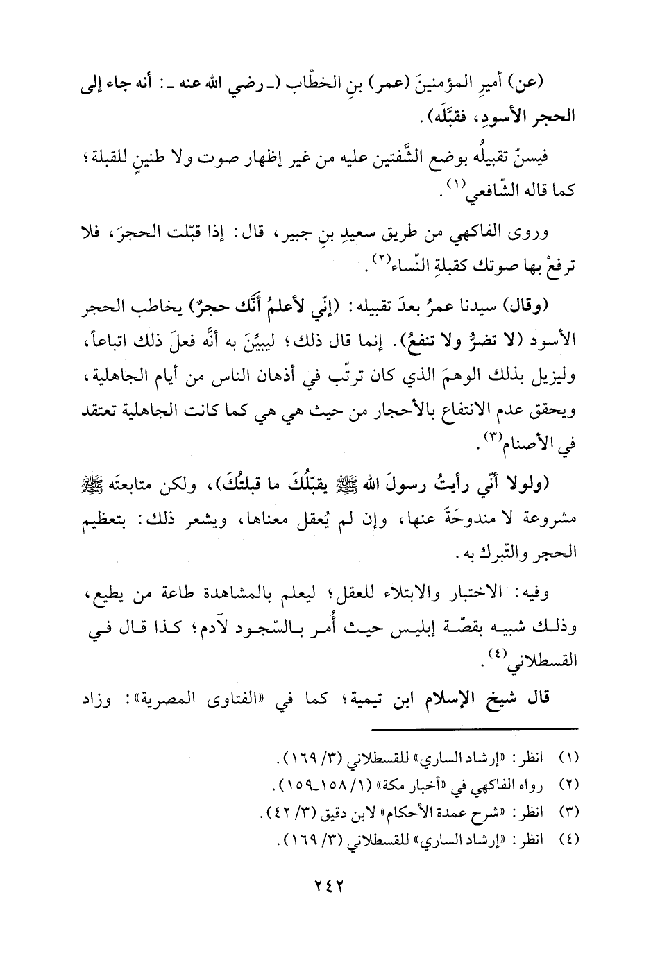(وقال) سيدنا عمرُ بعدَ تقبيله: (إنّي لأعلمُ أَنَّك حجرٌ) يخاطب الحجر الأسود (لا تضرُّ ولا تنفعُ). إنما قال ذلك؛ ليبيِّنَ به أنه فعلَ ذلك اتباعًا، وليزيل بذلك الوهمَ الذي كان ترتّب في أذهان الناس من أيام الجاهلية، ويحقق عدم الانتفاع بالأحجار من حيث هي هي كما كانت الجاهلية تعتقد في الأصنام (٣).