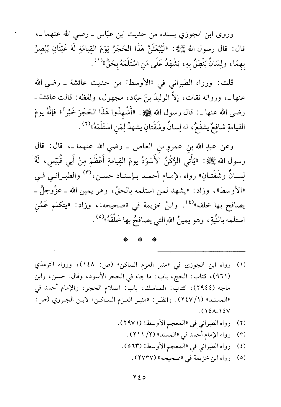 وروى ابن الجوزي بسنده من حديث ابن عبّاس -رضي اللَّه عنهما-، قال: قال رسول اللَّه -صلى اللَّه عليه وسلم-: "لَيُبْعَثَنَّ هَذَا الحَجَرُ يَوْمَ القِيامَةِ لَهْ عَيْنَانِ يُبْصِرُ بِهِمَا، ولِسَانٌ يَنْطِقُ بِهِ، يَشْهَدُ عَلَى مَنِ اسْتَلَمَهُ بِحَقٍّ" (١).