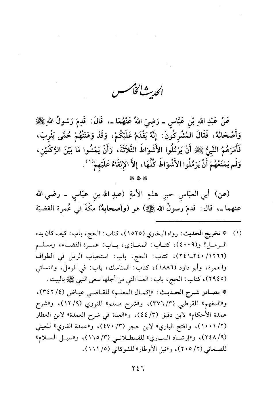 عَنْ عَبْدِ اللَّهِ بْنِ عَبَّاسٍ -رَضِيَ اللَّهُ عَنْهُمَا-، قَالَ: قَدِمَ رَسُولُ اللَّهِ -صلى اللَّه عليه وسلم- وَأَصْحَابُهُ، فَقَالَ المُشْرِكُونَ: إِنَّهُ يَقْدَمُ عَلَيْكُمْ، وَقَدْ وَهَنَتْهُمْ حُمَّى يَثْرِبَ، فَأَمَرَهُمُ النَّبِيُّ -صلى اللَّه عليه وسلم- أَنْ يَرْمُلُوا الأَشْوَاطَ الثَّلَاثَةَ، وَأَنْ يَمْشُوا مَا بَيْنَ الرُّكنَيْنِ، وَلَم يَمْنَعْهُمْ أَنْ يَرْمُلُوا الأَشْوَاطَ كُلَّهَا، إِلَّا الإِبْقَاءُ عَلَيْهِمْ (١).