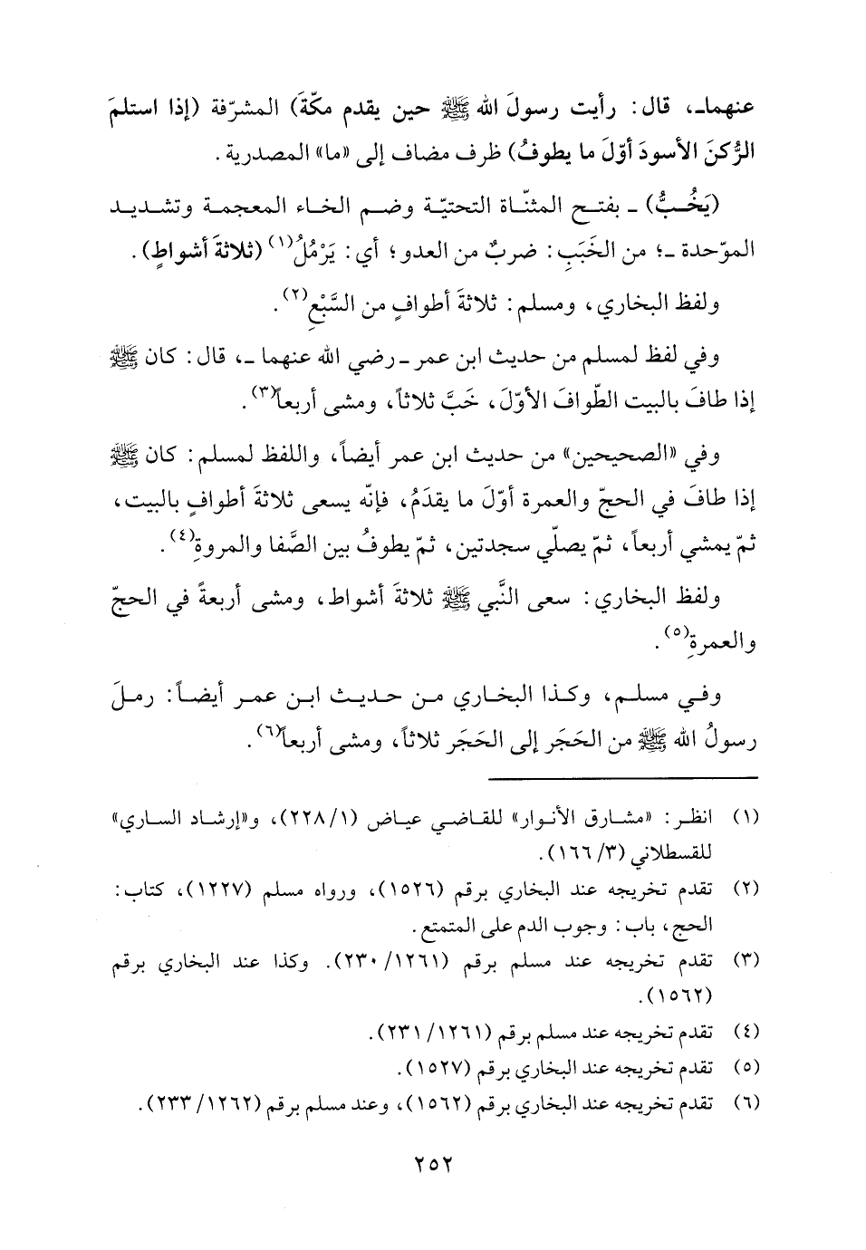ولفظ البخاري: سعى النَّبي -صلى اللَّه عليه وسلم- ثلاثةَ أشواط، ومشى أربعةً في الحجّ والعمرةِ (٥).