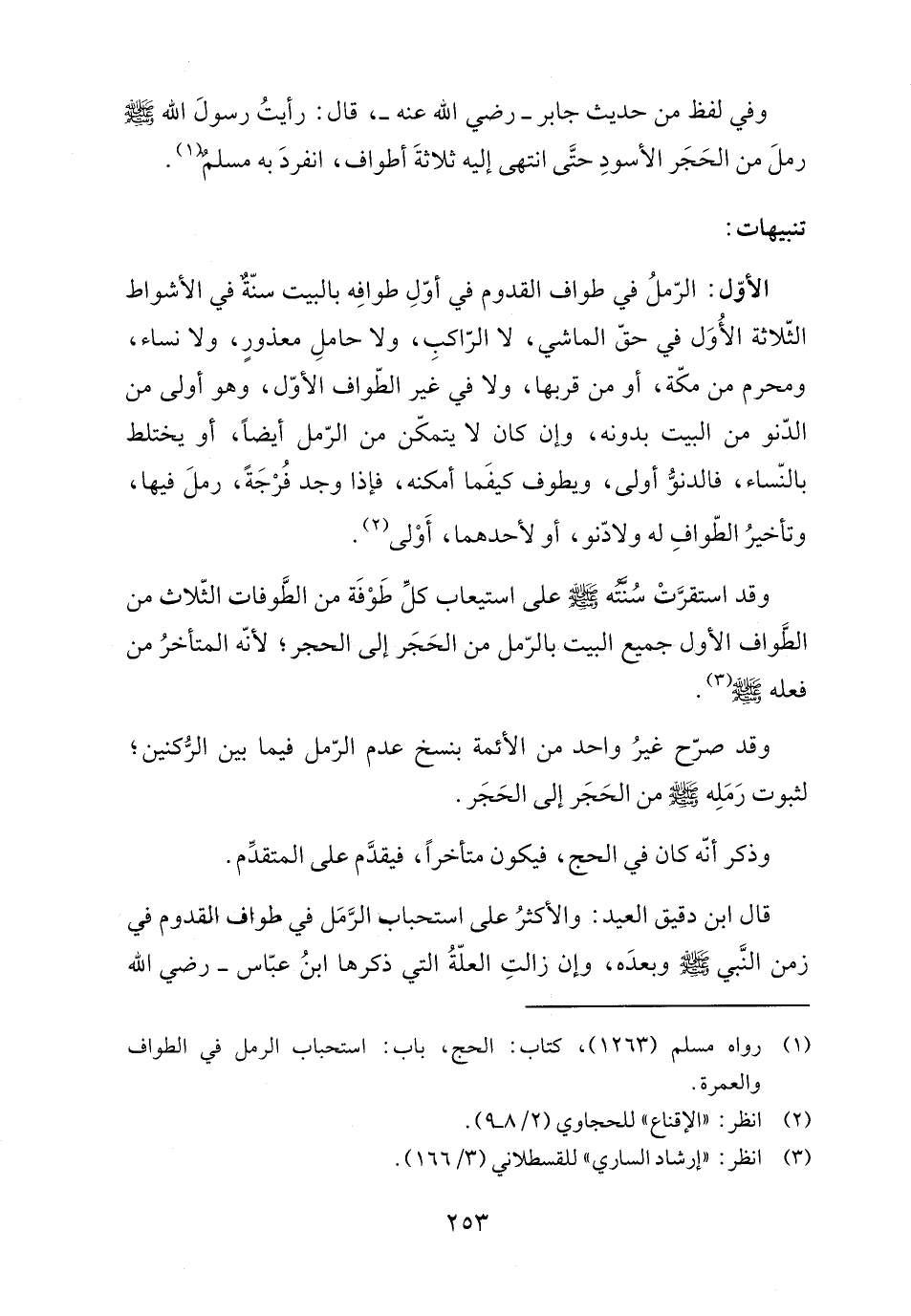 وفي لفظ من حديث جابر -رضي اللَّه عنه-، قال: رأيتُ رسول اللَّه -صلى اللَّه عليه وسلم- رملَ من الحَجَر الأسودِ حتَّى انتهى إليه ثلاثةَ أطواف، انفردَ به مسلمٌ (١).