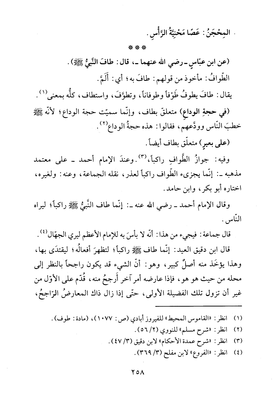 وفيه: جوازُ الطَّوافِ راكبًا، (٣) وعندَ الإمام أحمد -على معتمد مذهبه-: إنّما يجزىء الطّواف راكبًا لعذر، نقله الجماعة، وعنه: ولغيره، اختاره أبو بكر، وابن حامد.