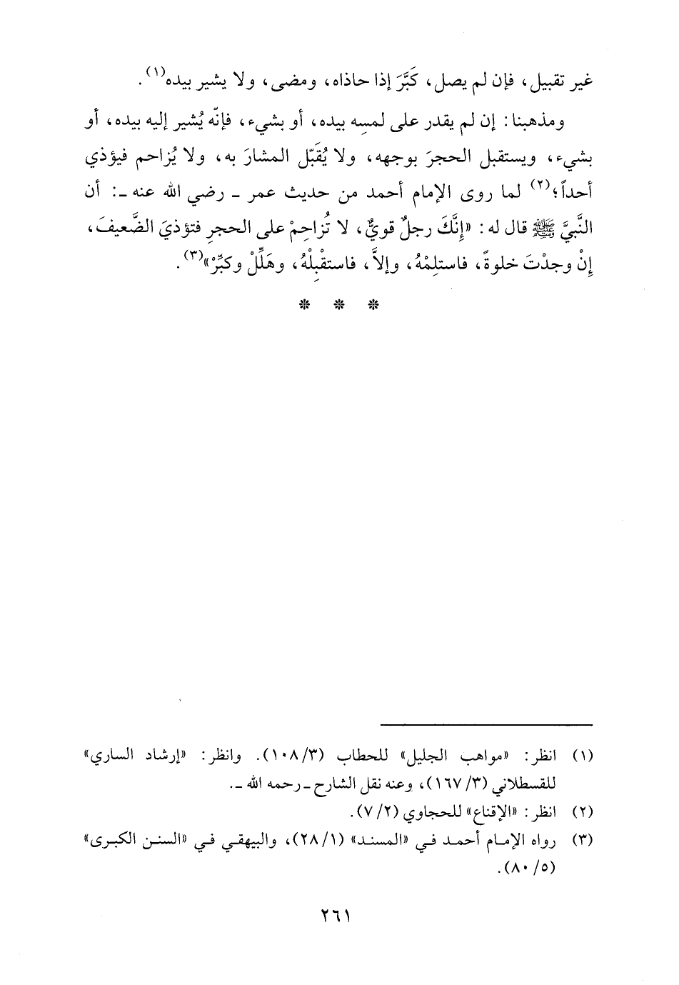 ومذهبنا: إن لم يقدر على لمسِه بيده، أو بشيء، فإنّه يشير إليه بيده، أو بشيء، ويستقبل الحجرَ بوجهه، ولا يُقَبّل المشارَ به، ولا يزاحم فيؤذي أحدًا؛ (٢) لما روى الإمام أحمد من حديث عمر -رضي اللَّه عنه-: أن النَّبيَّ -صلى اللَّه عليه وسلم- قال له: "إِنَّكَ رجلٌ قويٌّ، لا تُزاحِمْ على الحجرِ فتؤذيَ الضَّعيفَ، إِنْ وجدْتَ خلوةً، فاستلِمْهُ، وإلَّا، فاستقْبِلْهُ، وهَلِّلْ وكبِّرْ" (٣).