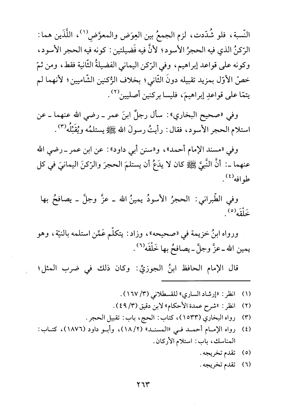 ورواه ابنُ خزيمة في "صحيحه"، وزاد: يتكلّم عَمَّن استلمه بالنيّة، وهو يمين اللَّه -عزَّ وجلَّ- يصافحُ بها خَلْقَه (٦).